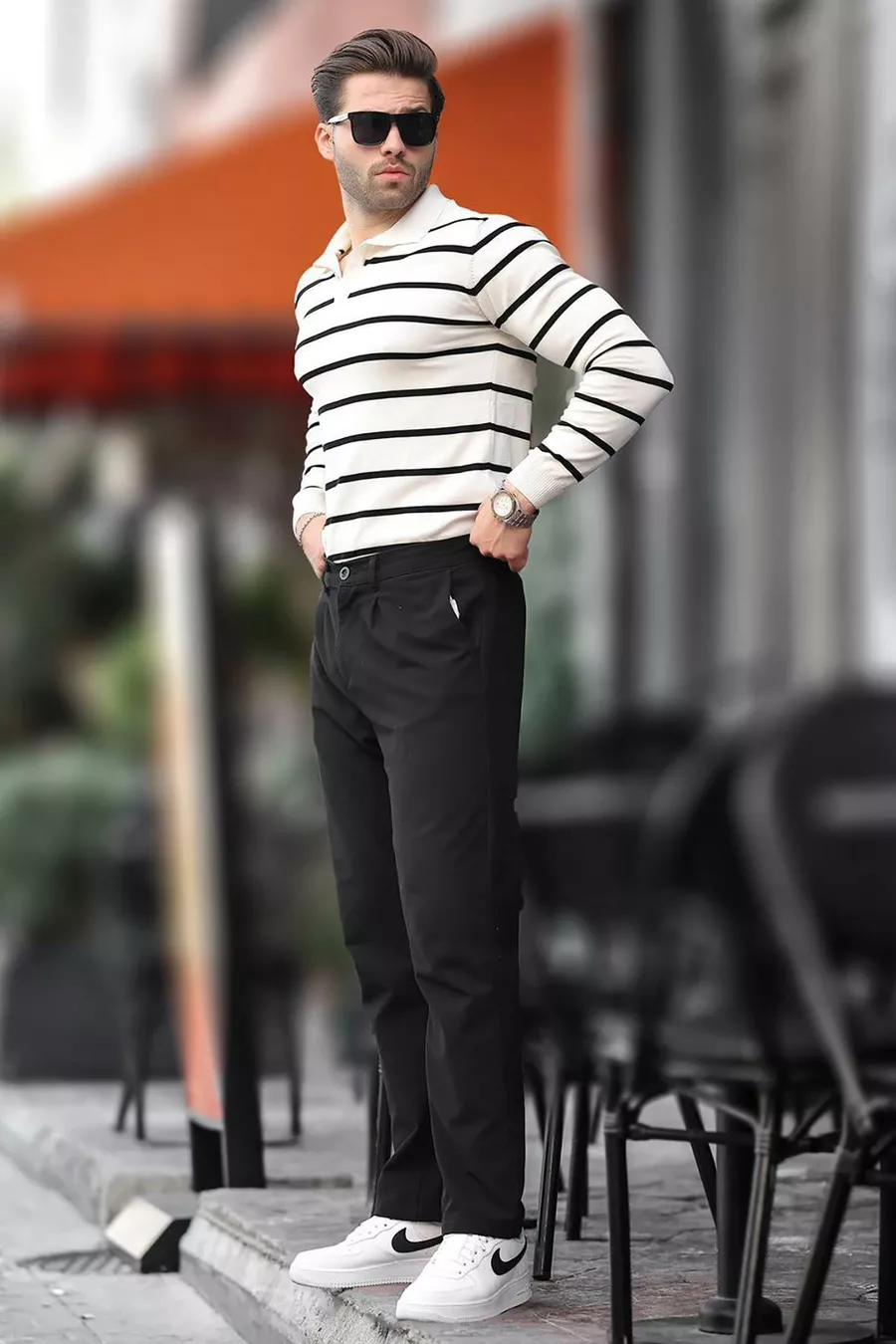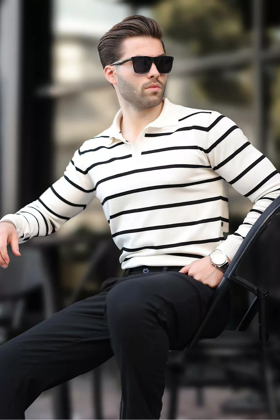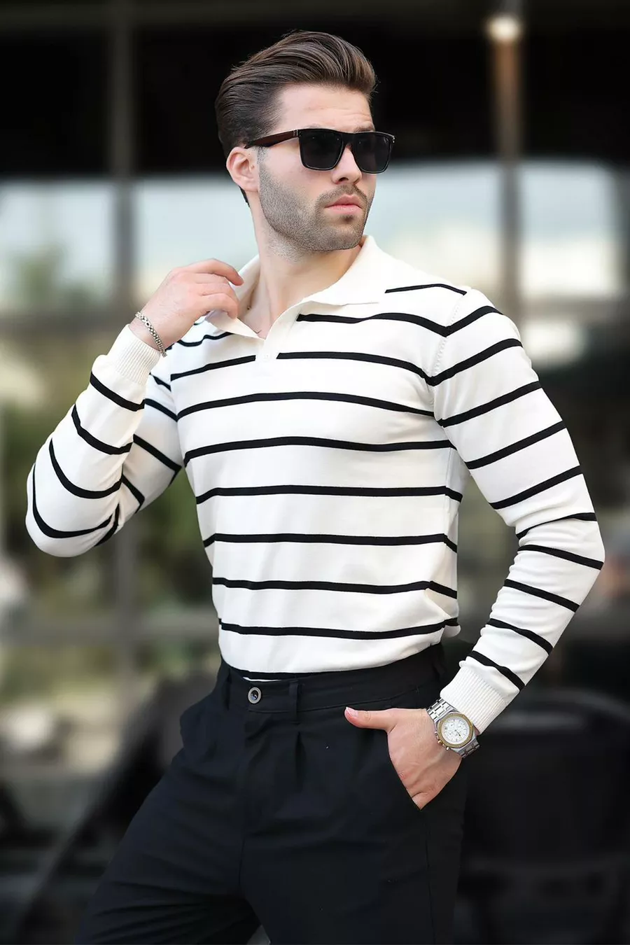 Джемпер с длинными рукавами в белую полоску с воротником-поло и белыми пуговицами