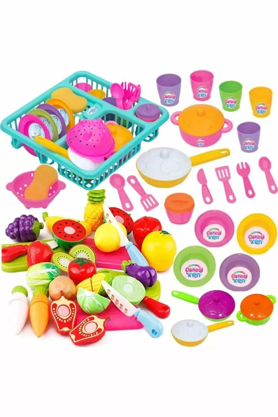 Игрушечный набор с посудой: тарелки, кастрюли и нарезные игрушечные фрукты и овощи, всего деталей