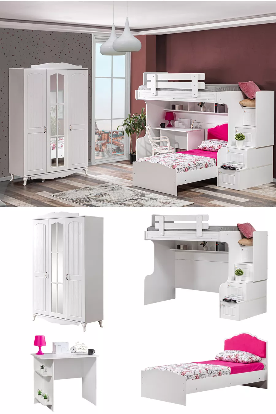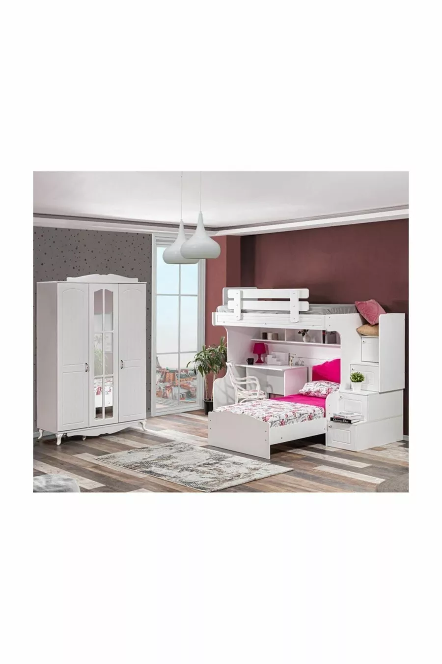 Кровать-чердак, водяная кровать-чердак, кровать, стол, шкаф с 3 дверцами
