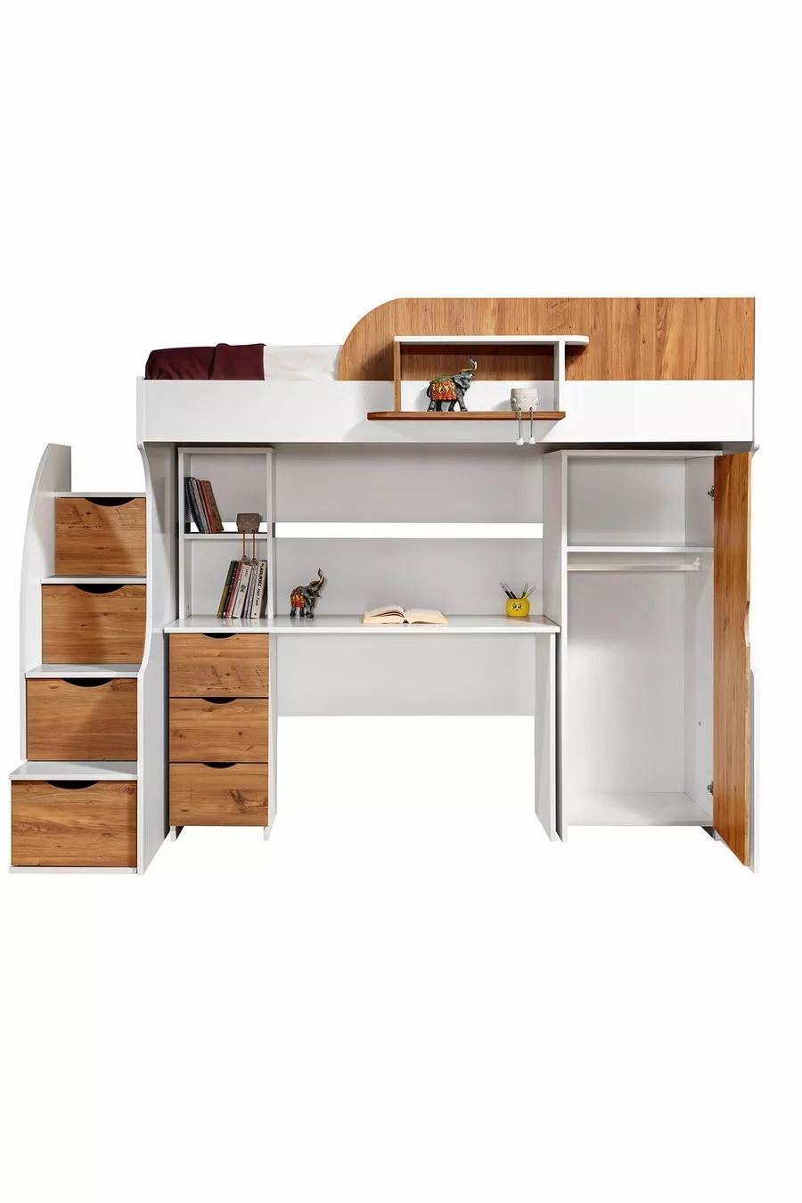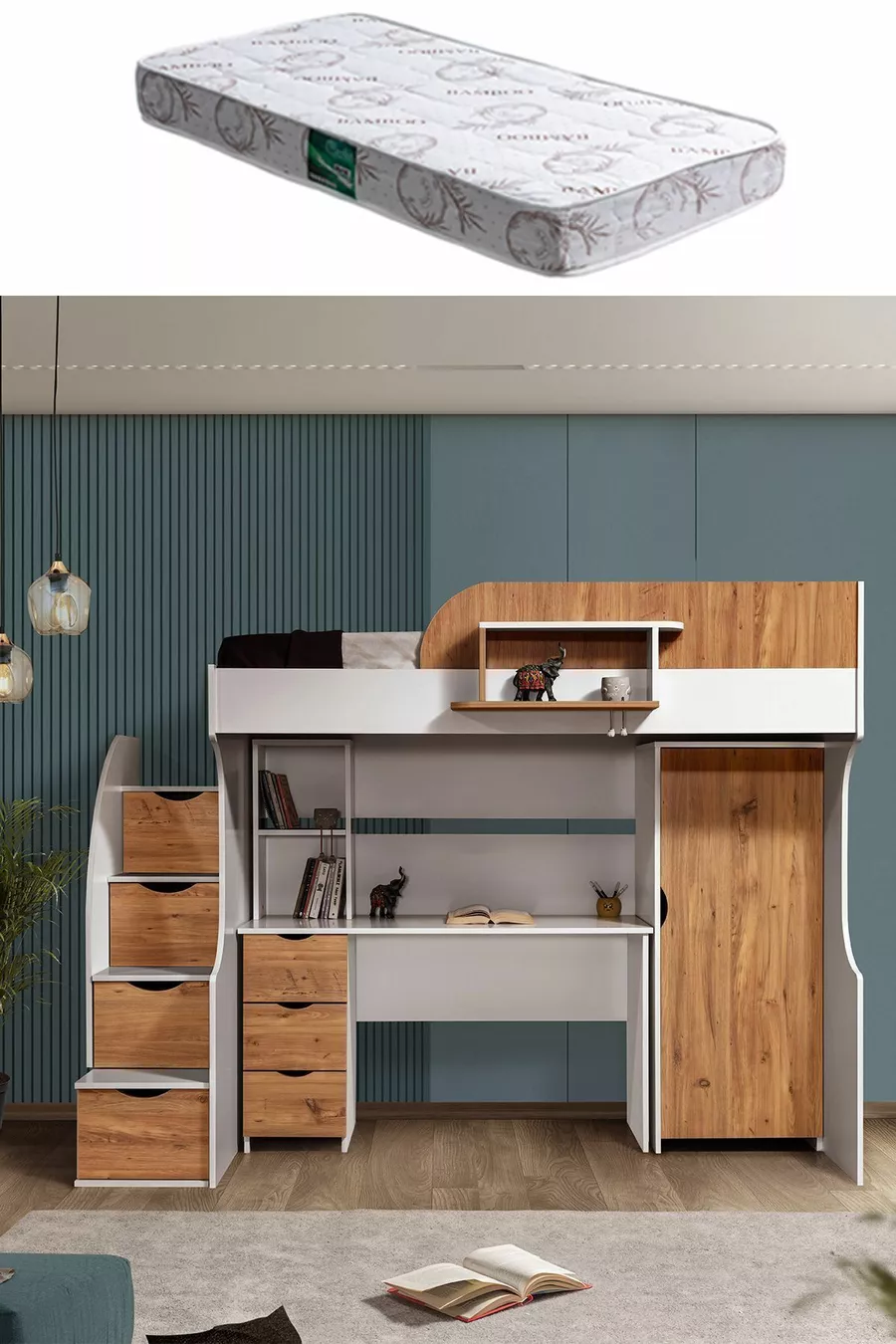 Кровать-чердак, шкаф и письменный стол Litera, бело-темный орех, 1 шт. с комфортным матрасом