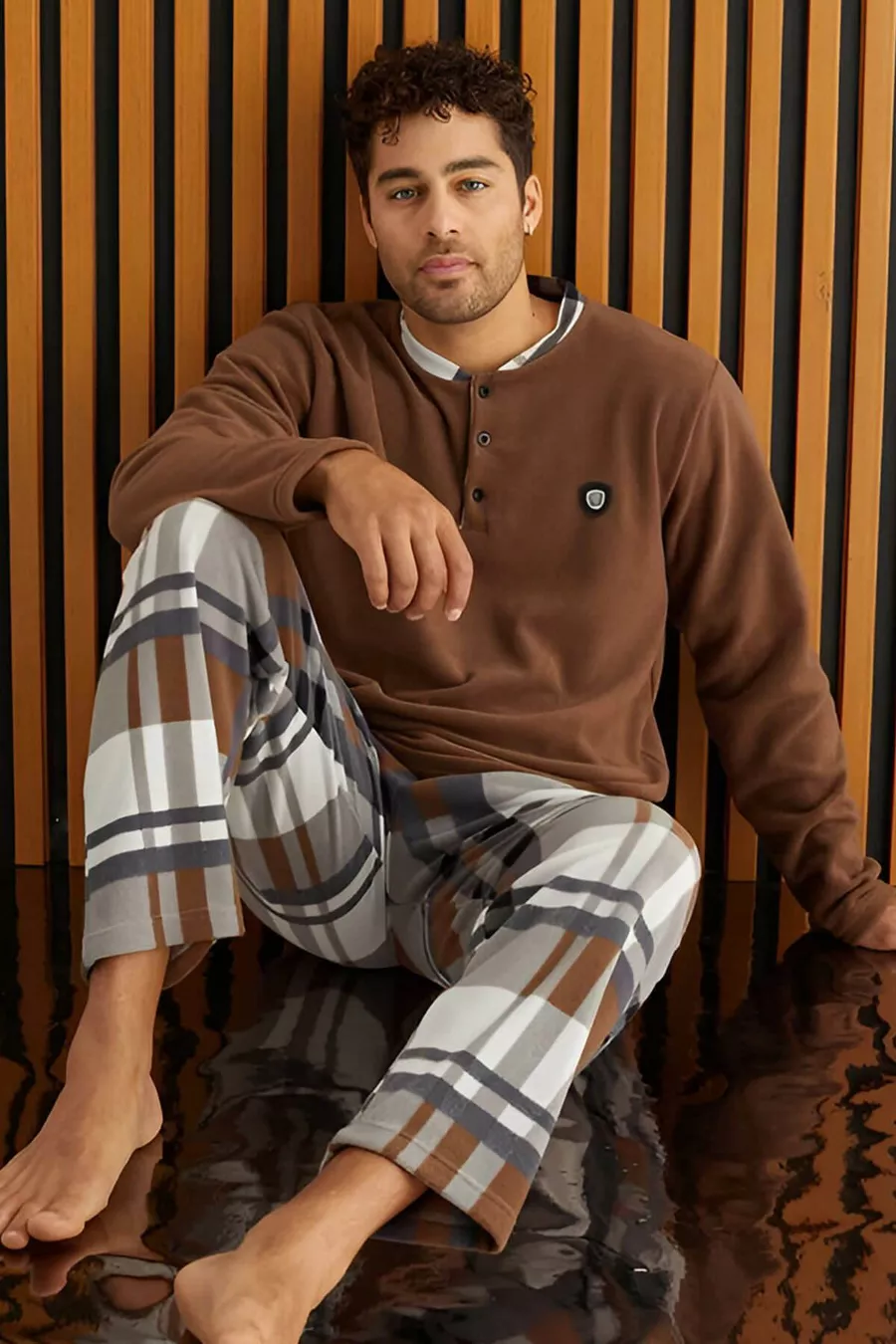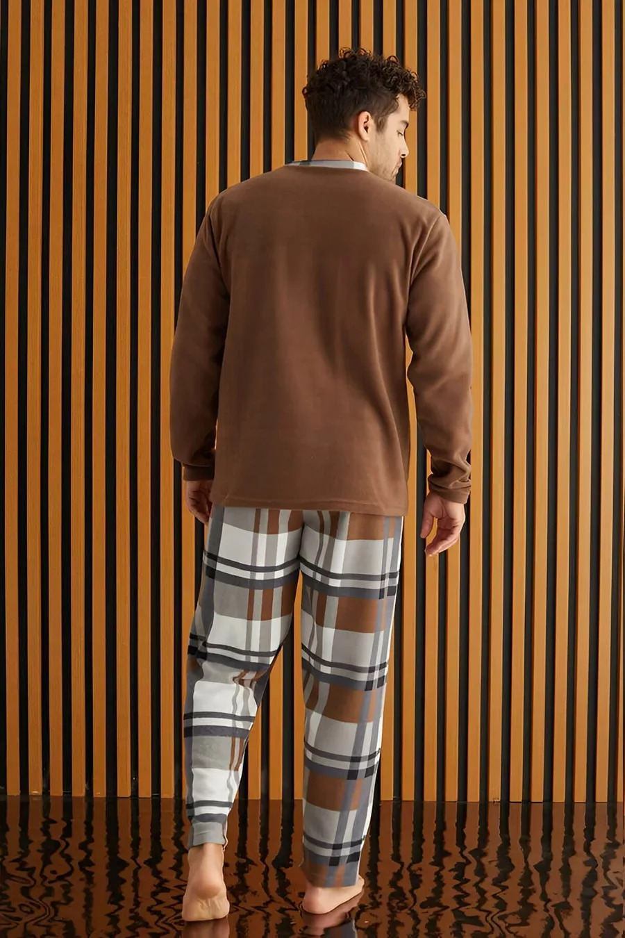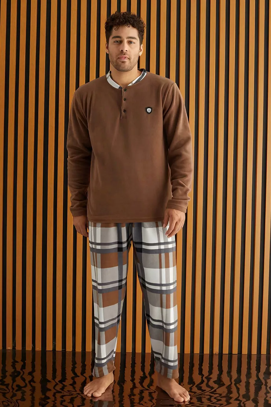 Мужская пижама из флиса с бело-коричневой клеткой