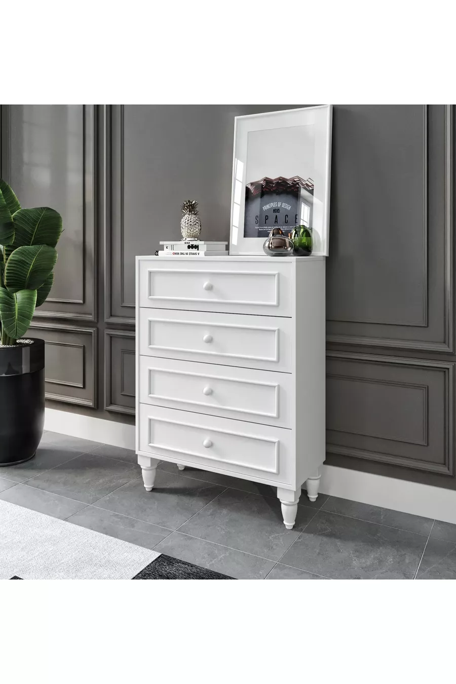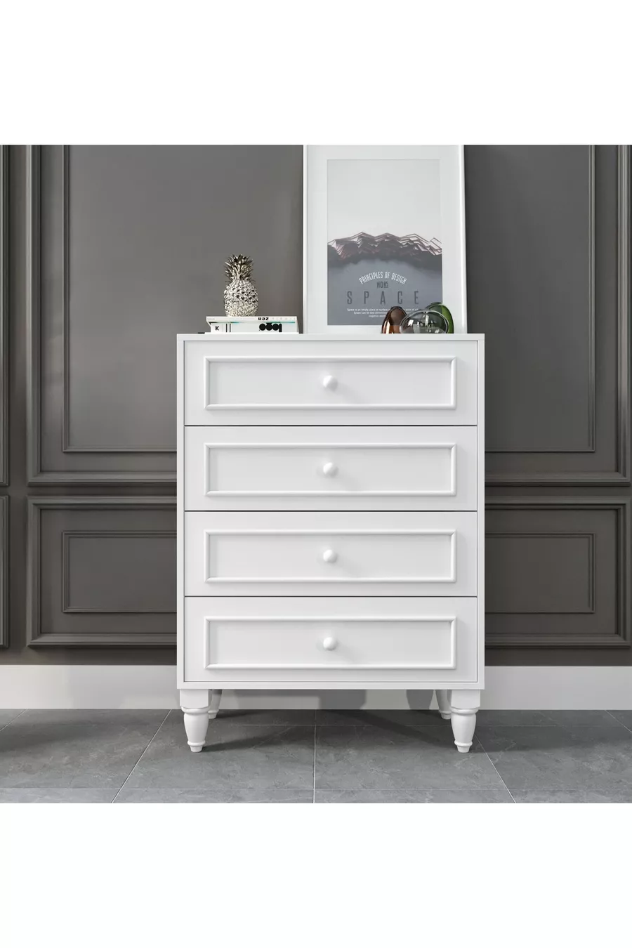Романтический 4-ярусный комод, авангард, белый (МДФ)