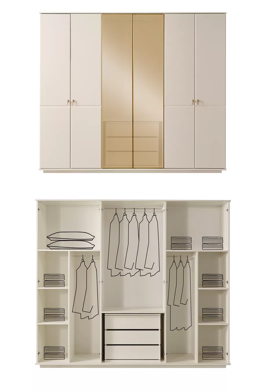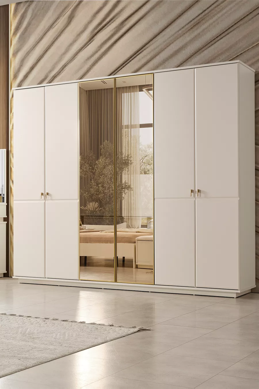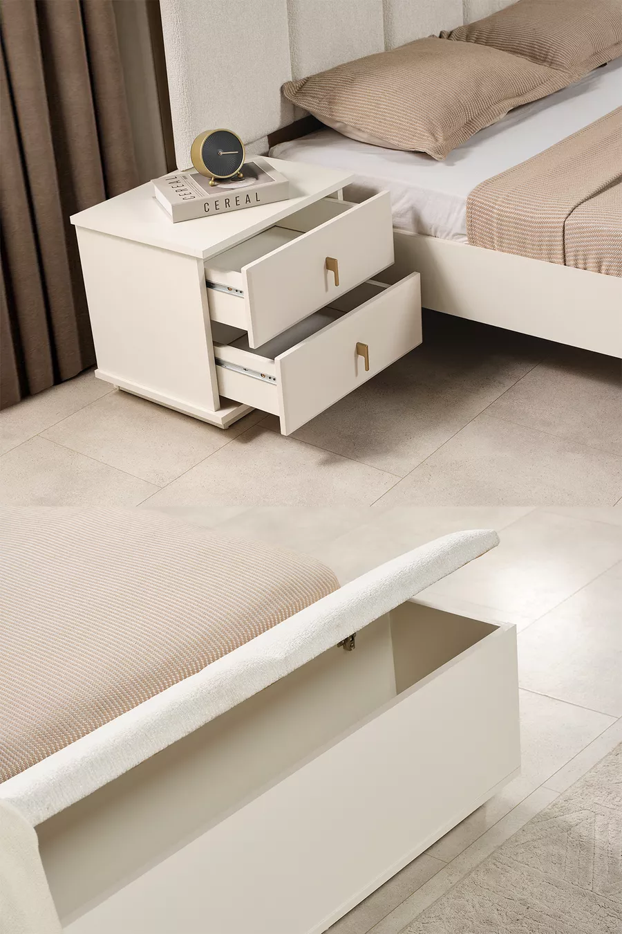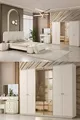 Комплектация: Кровать с основанием + 2 прикроватные тумбочки + комод + шкаф