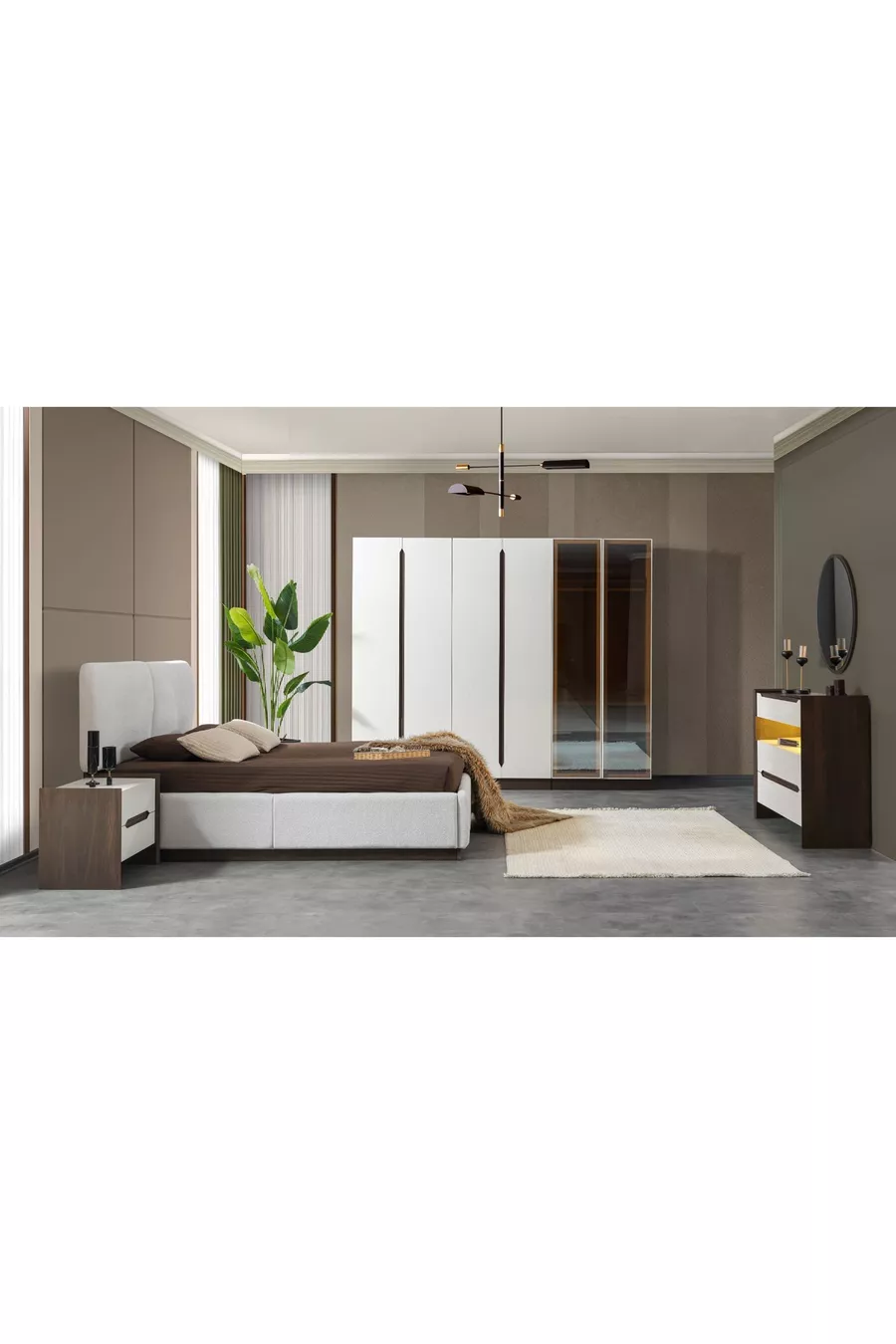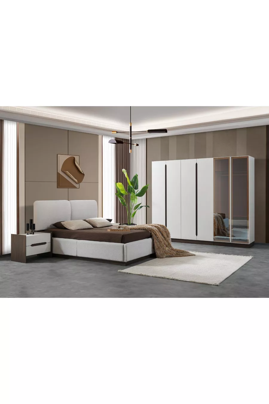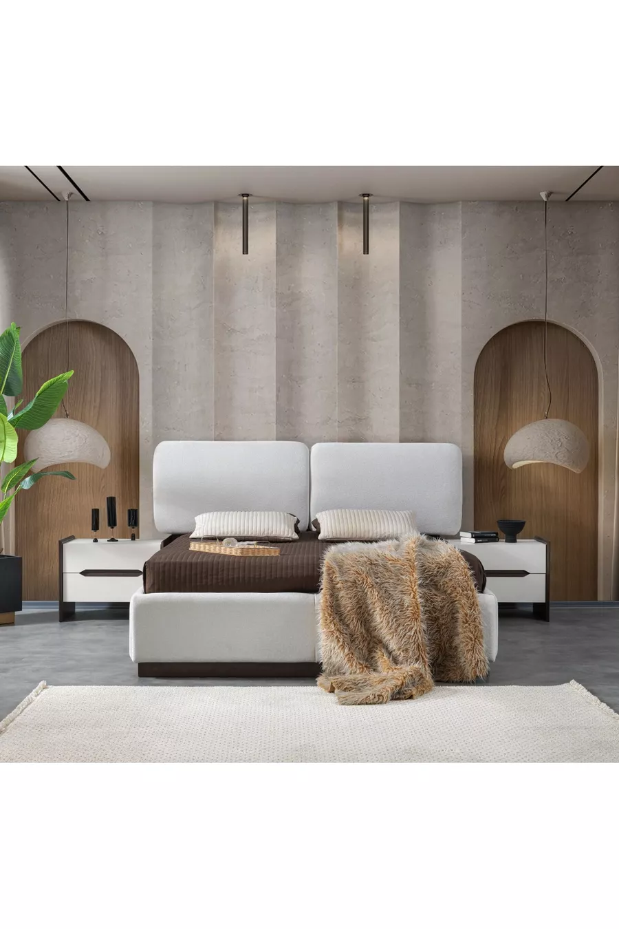 Комплектация: Кровать с основанием + 2 прикроватные тумбочки + комод + шкаф