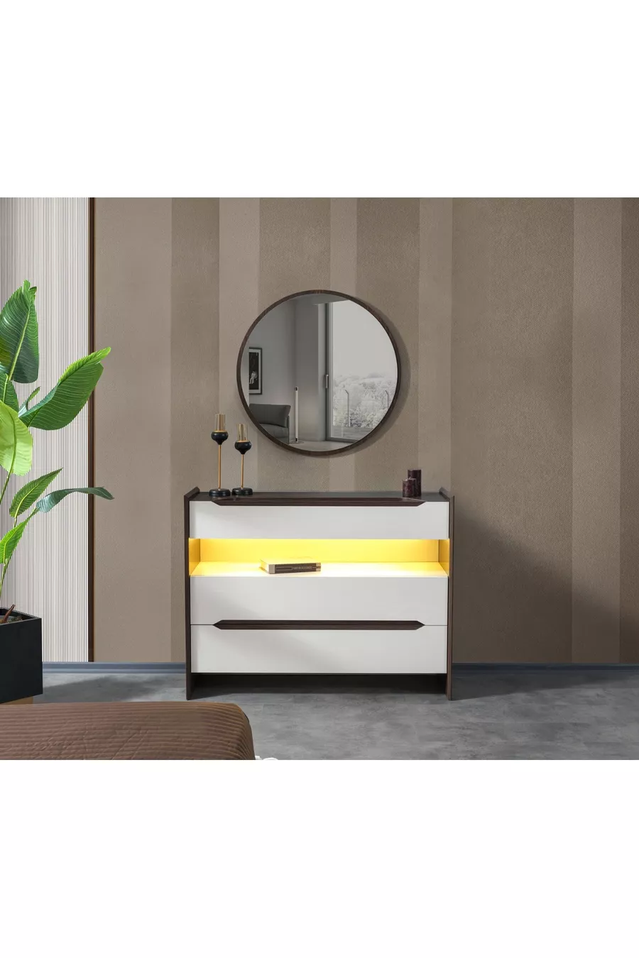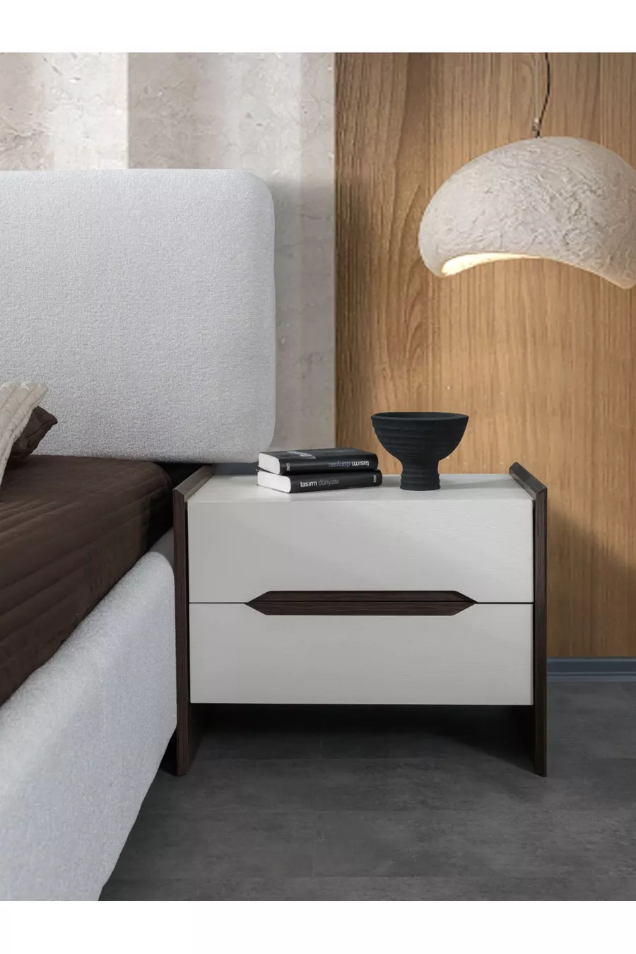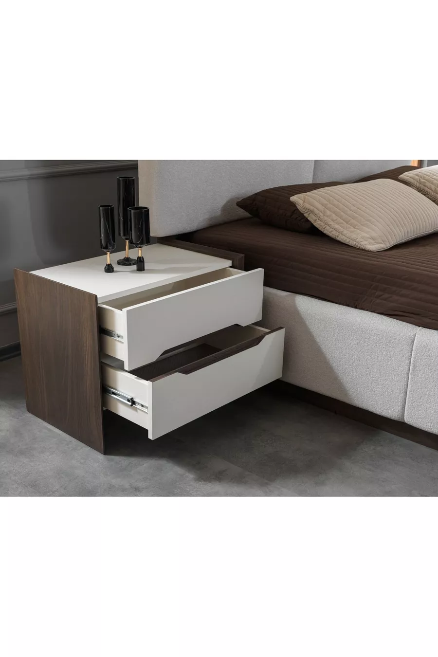 Комплектация: Кровать с основанием + 2 прикроватные тумбочки + комод + шкаф