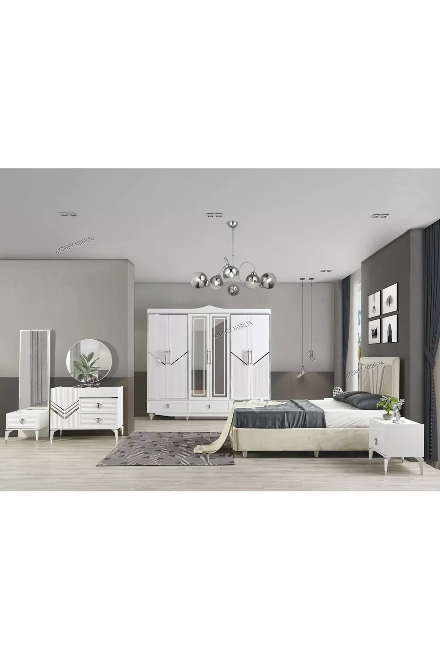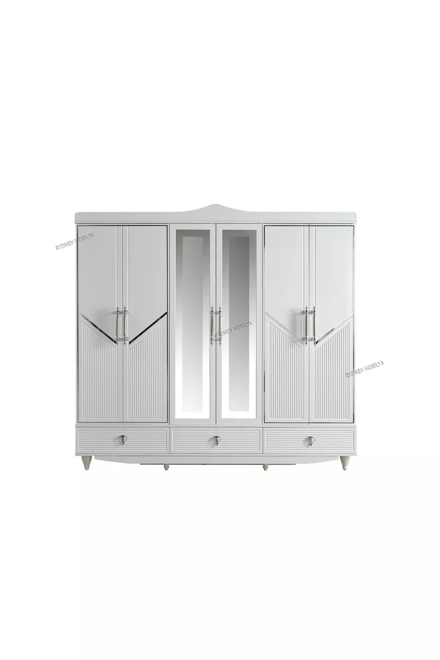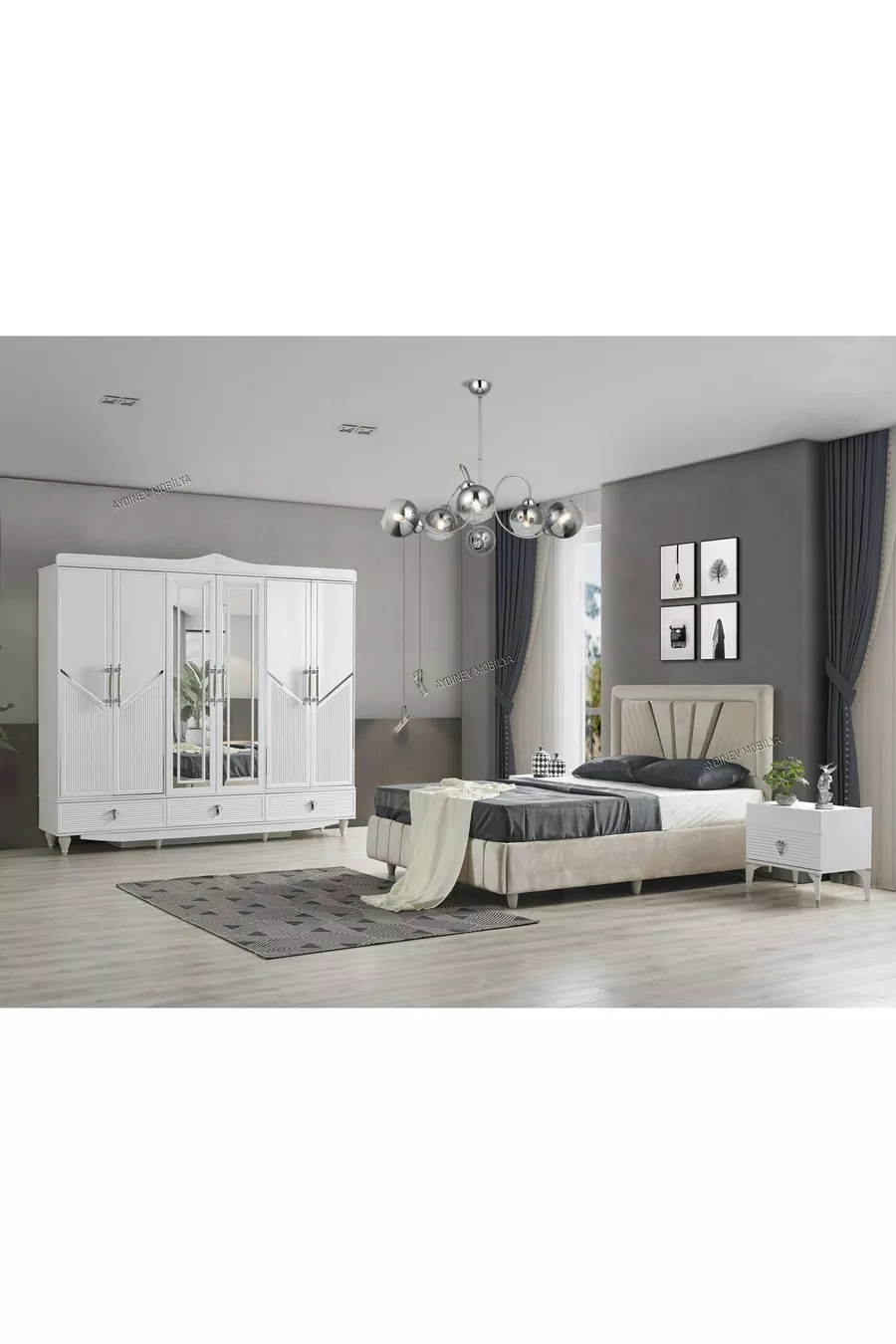 Цвет: Белый Гарантийный срок: 2 года Размер кровати/основания: 160 x 200 Функция кровати: Без основания Функция шкафа: С дверцами Материал корпуса шкафа: МДФ Количество дверец: 6 Комплект включает: Шкаф + 2 прикроватные тумбочки + комод + изголовье кровати Стиль: Современный Тема / стиль: Современный Страна происхождения: Турция Особенности: С дверцами