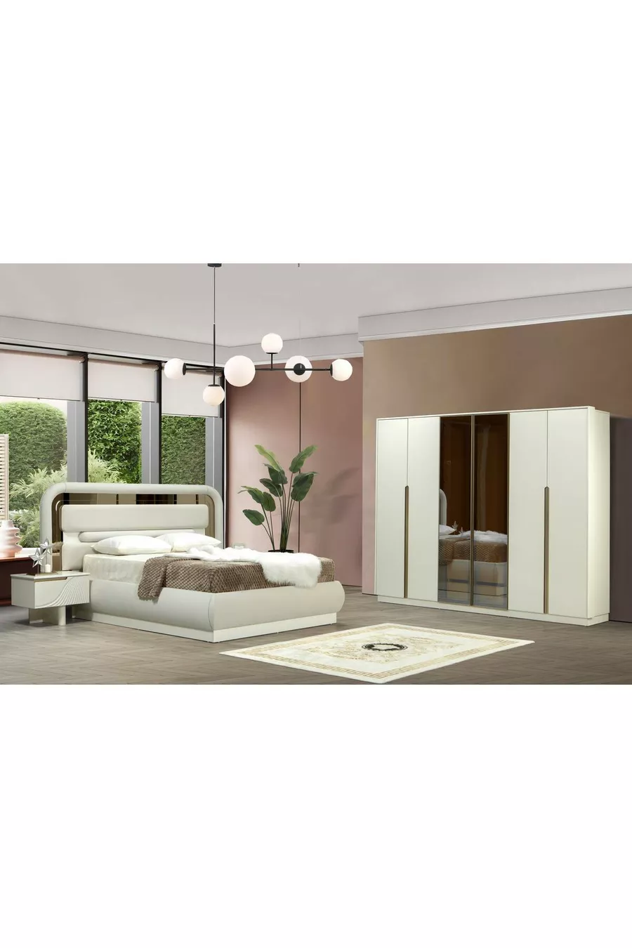 Цвет: Экру Гарантия: 2 года Размер кровати/основания: 160 x 200 Функция кровати: с основанием Функция шкафа: с зеркалом Материал корпуса шкафа: ЛДСП Количество дверей: 6 Комплектация: Кровать + 2 прикроватные тумбочки + Комод + Шкаф Стиль: Современный Тема / стиль: Современный Страна производства: Турция Особенности: Монолитный