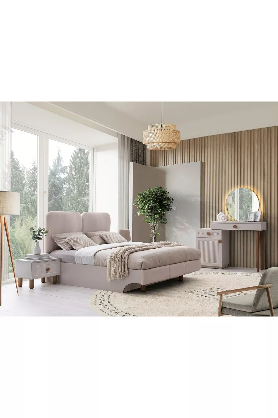 Состав комплекта: Кровать с основанием + 2 тумбочки + комод + шкаф