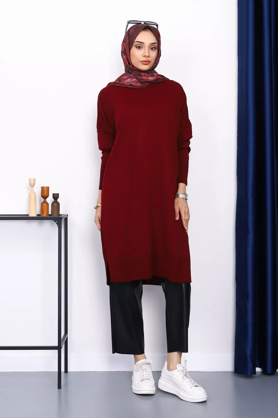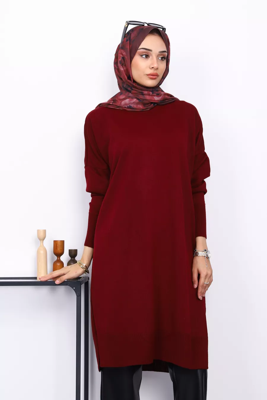 Темно-бордовый свободный трикотажный туник с круглым воротом из мерсеризованного хлопка