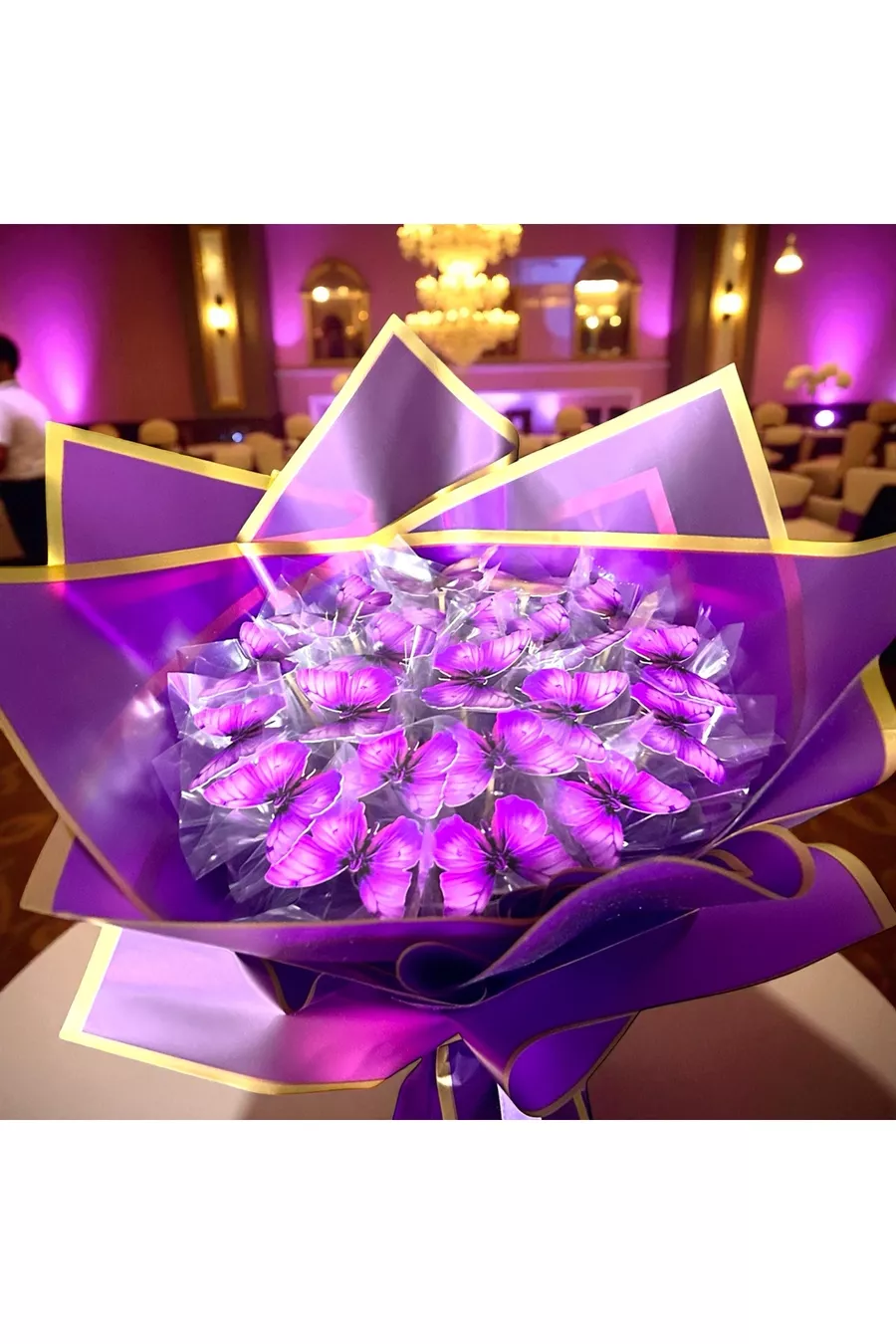 ФИОЛЕТОВАЯ ЗОЛОТАЯ УПАКОВКА ОБНОВЛЕНА СВЕТЯЩИЙСЯ В СВЕТЕ СВЕТОДИОДА БУКЕТ БАБОЧКИ ПОДАРОК ДЛЯ МАМЫ, ЛЮБИМОЙ, ДРУГА ИСКУССТВЕННЫЕ ЦВЕТЫ