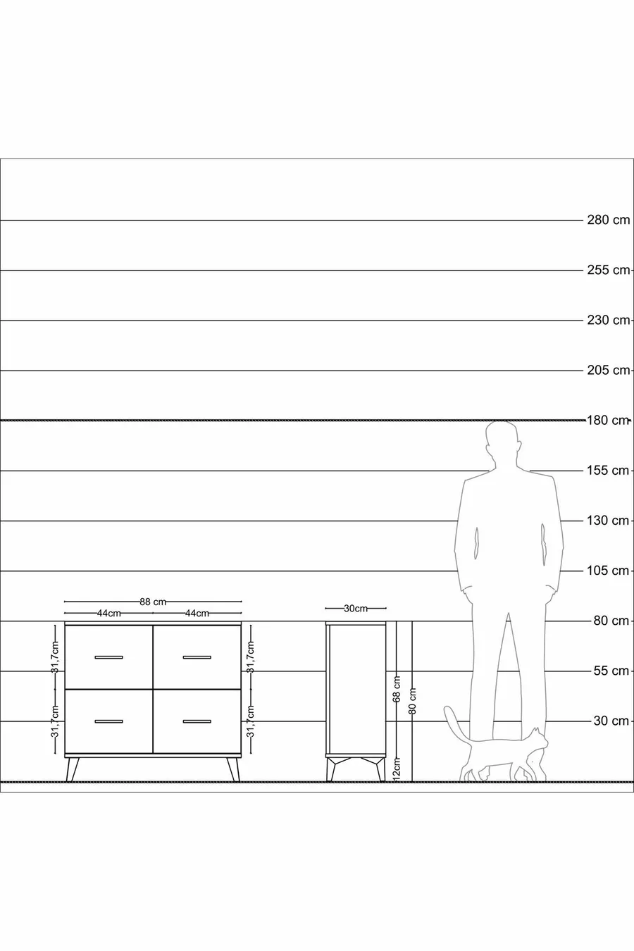 Цвет: Белый Материал: ДСП меламиновое Высота: 80 см Ширина: 88 см Глубина: 30 см Количество ящиков: 4 Особенности изделия: С дверцей Стиль: Современный Тема / стиль: Современный Происхождение: Турция