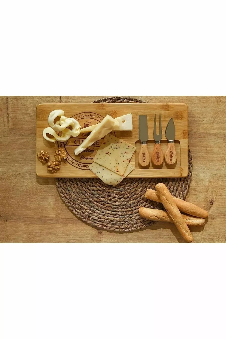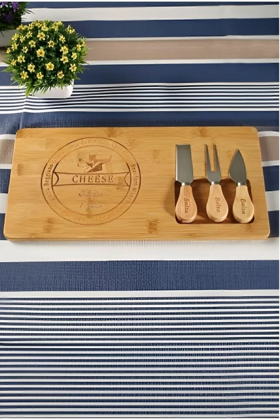 Özel Bambu 3 Bıçaklı Dekoratif Peynir Sunum Tahtası Kahvaltı Seti Koza Gift