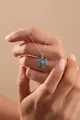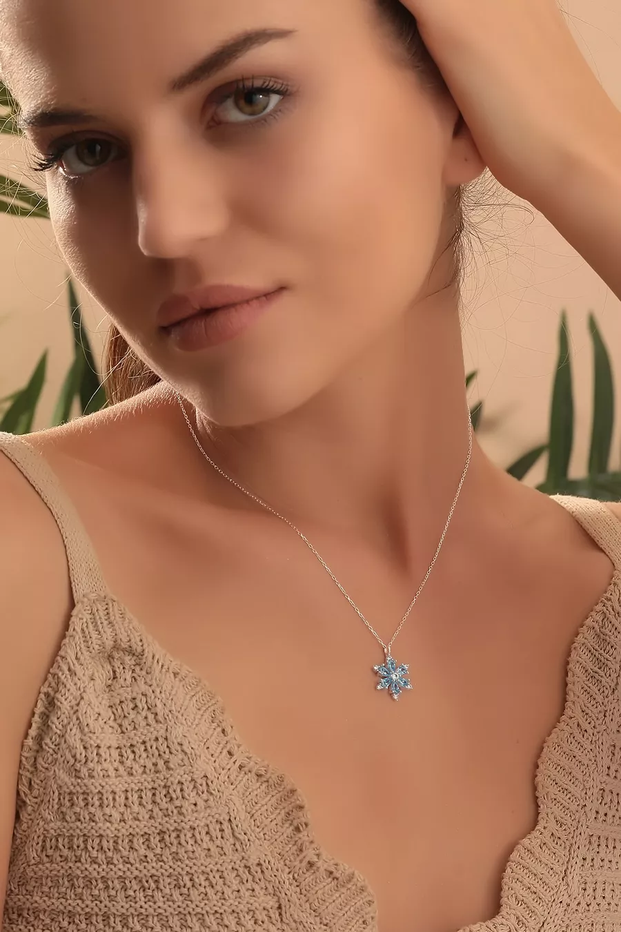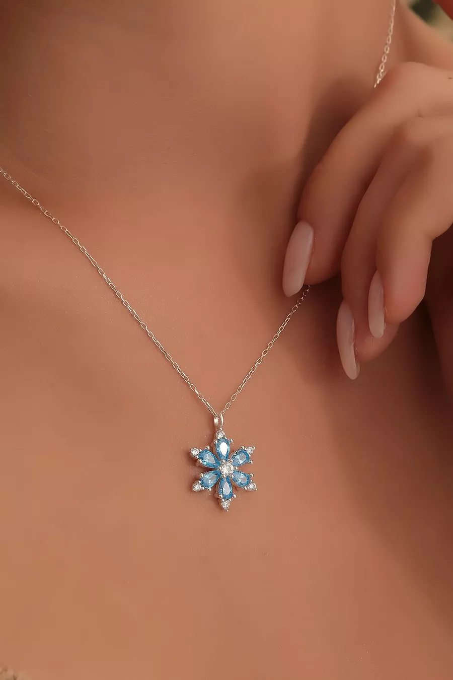 Ayar Gümüş Zincirli Akuamarin Taşlı Lotus Kamelya Yaşam Çiçeği Kolye