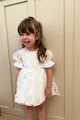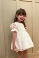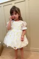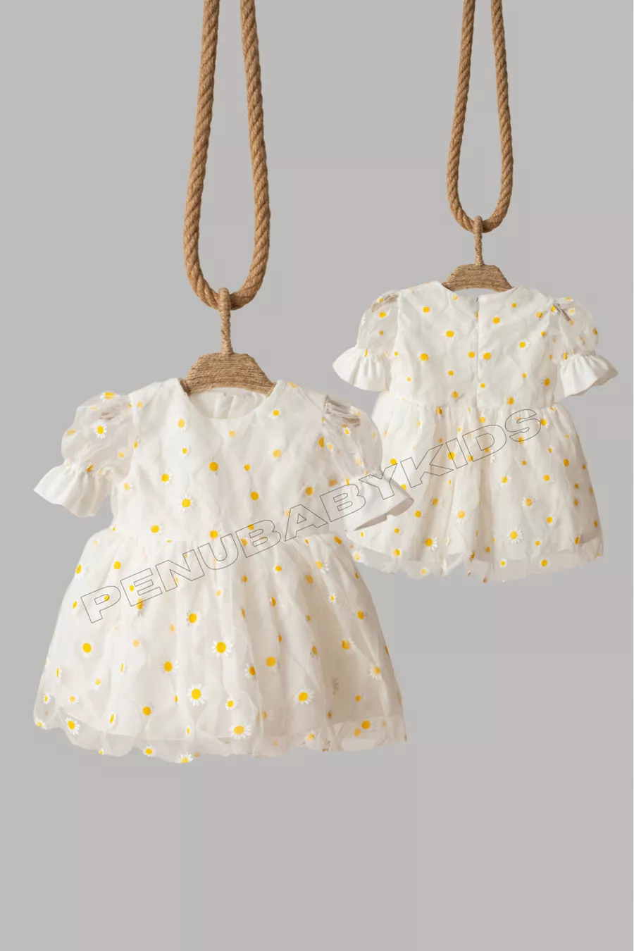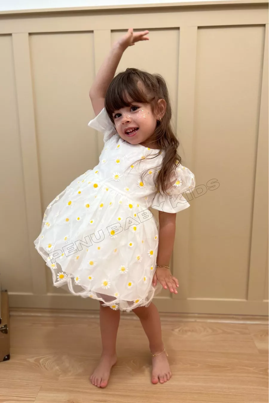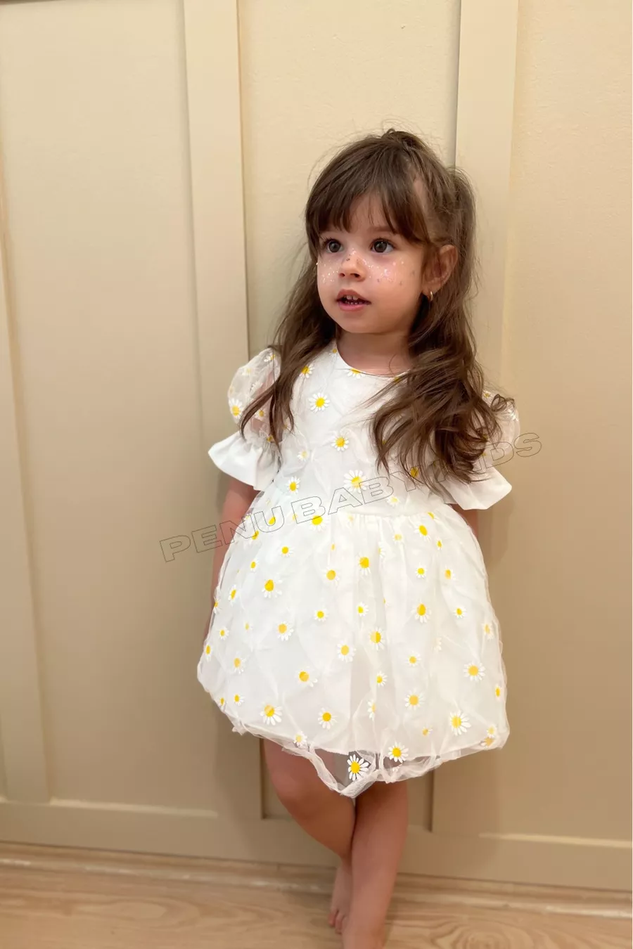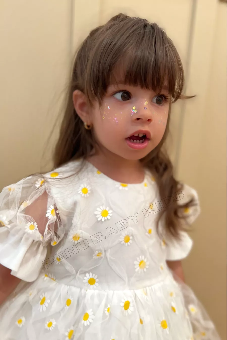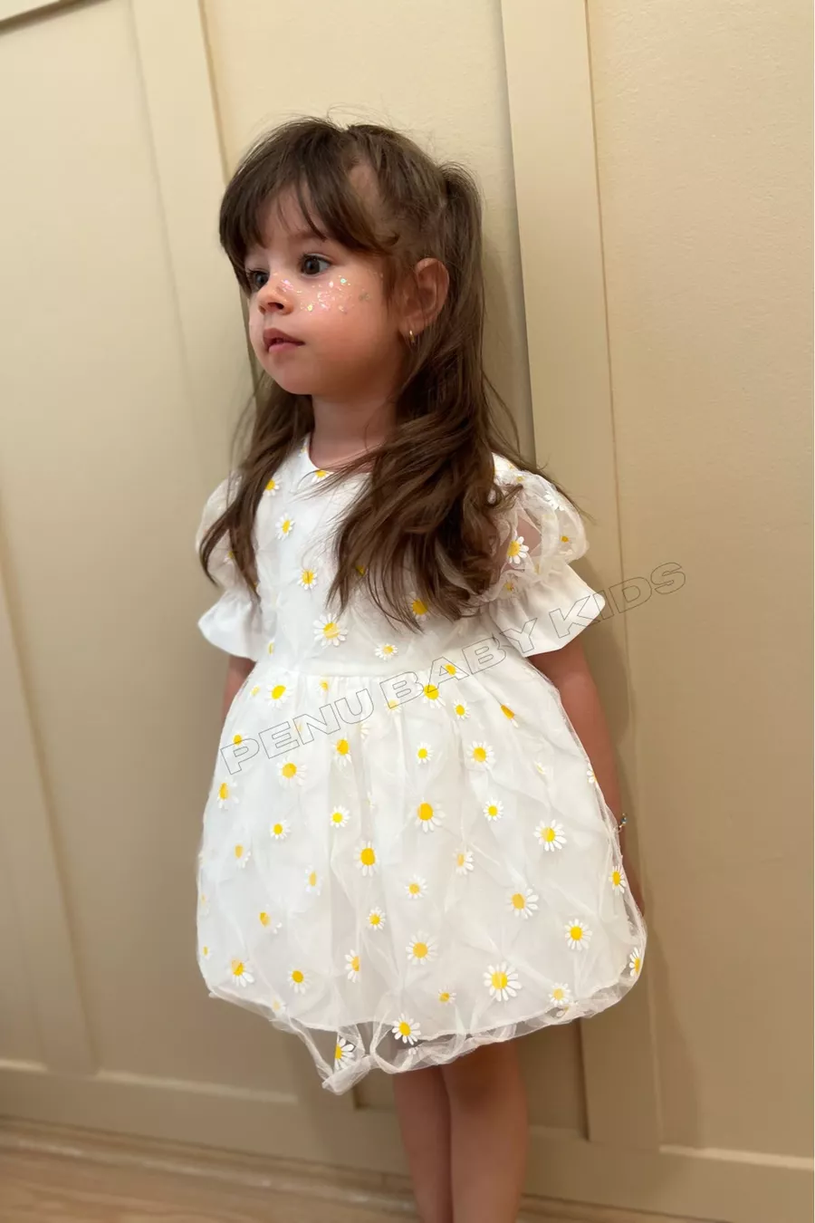 Beyaz Papatya Nakış Işlemeli Kısa Kol Kız Bebek - Çocuk Elbise - Elisa