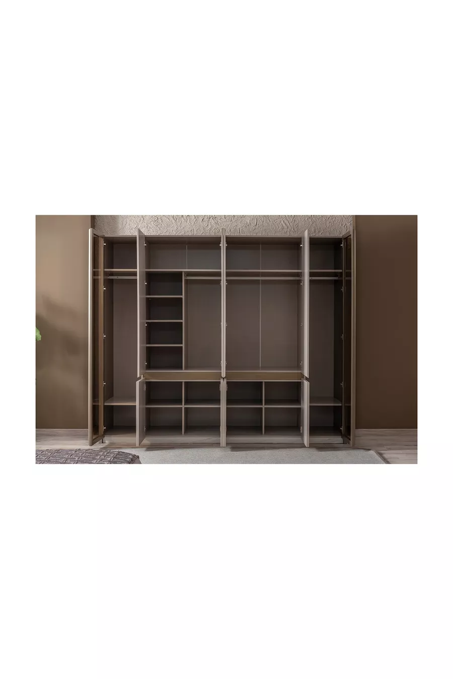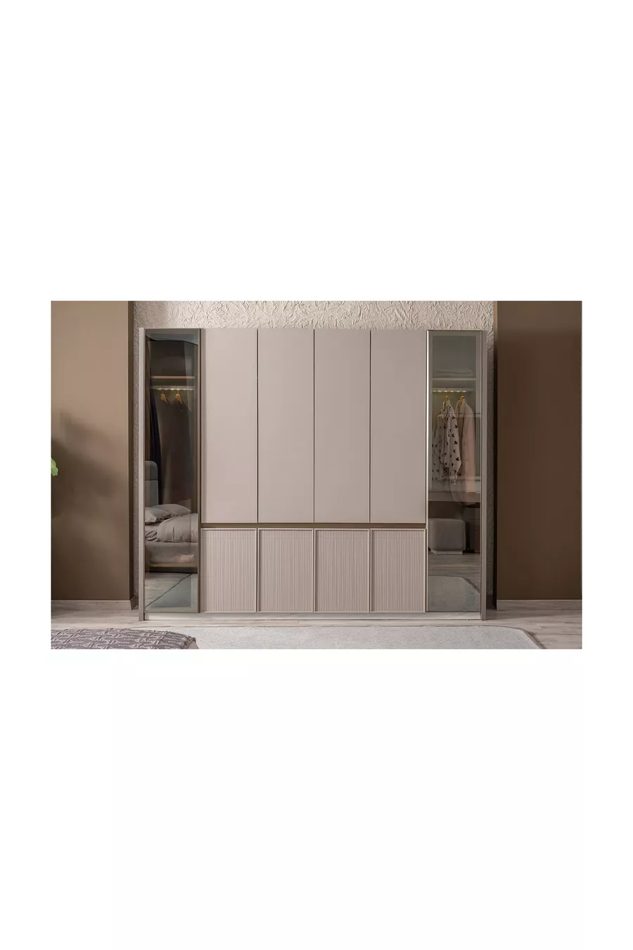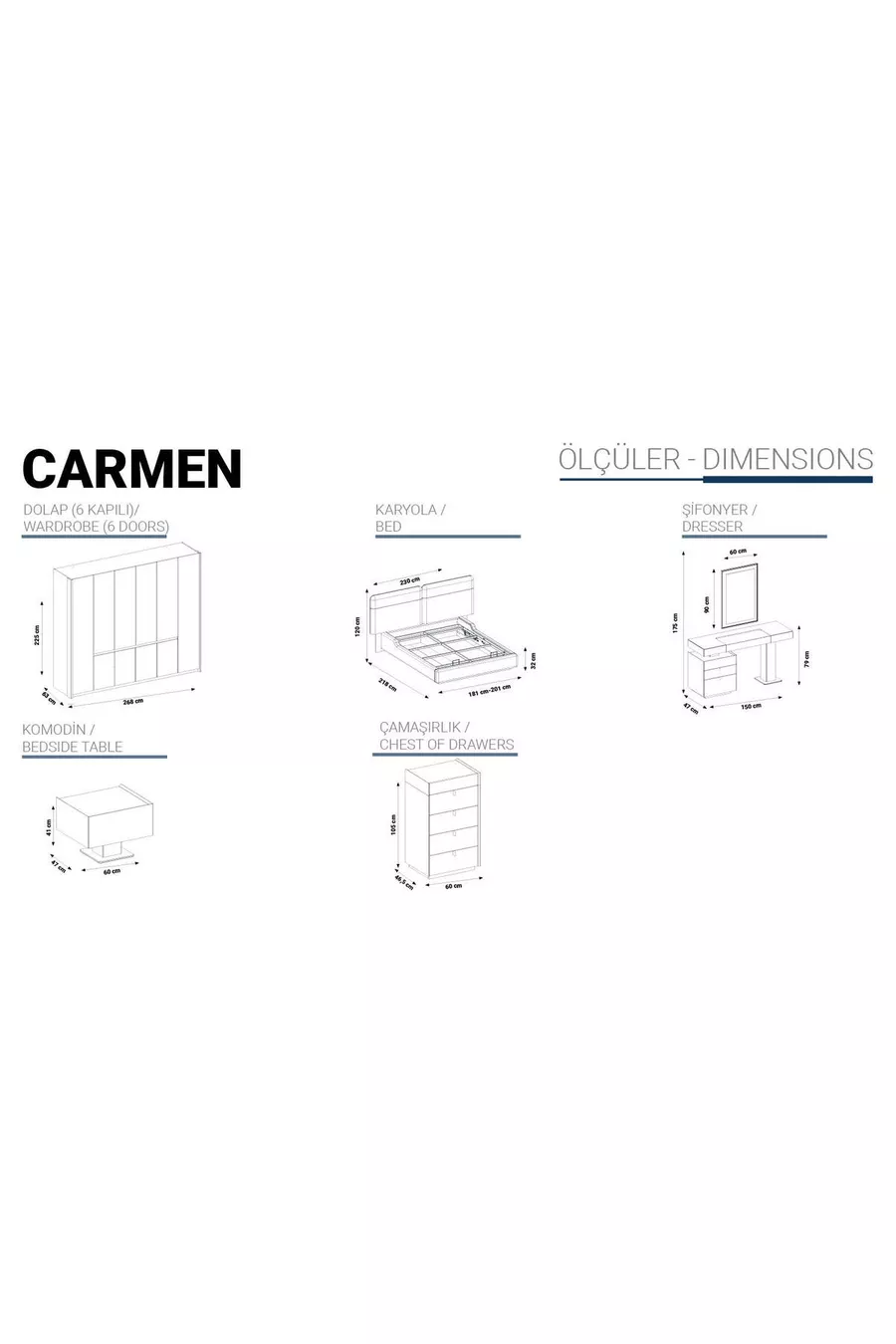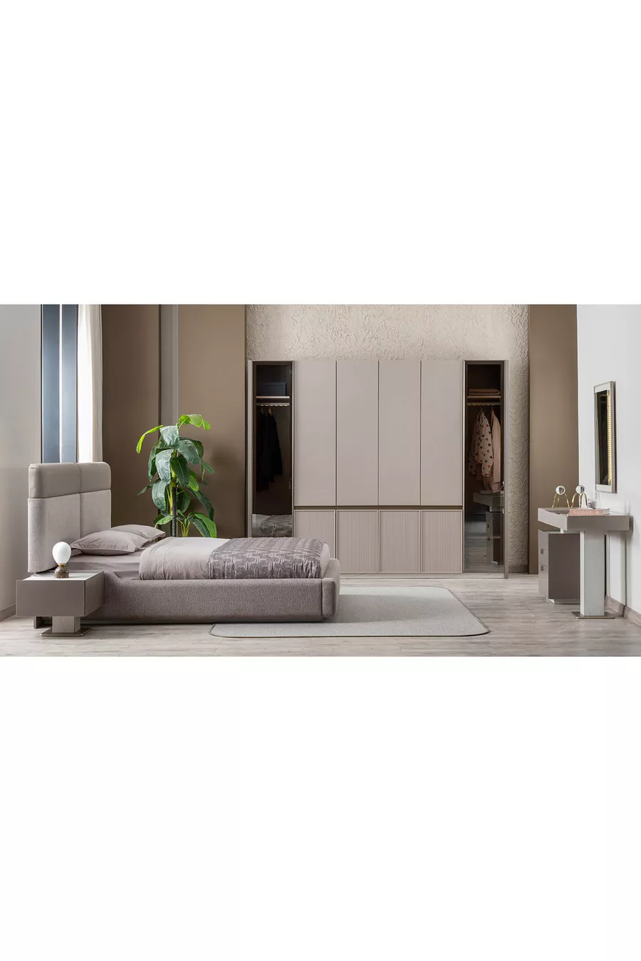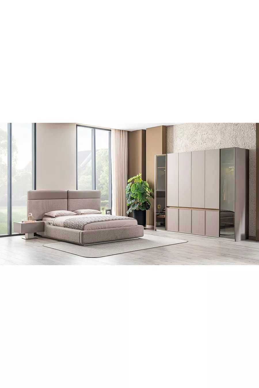 Set İçeriği:Gardırop + 2 Komodin + Şifonyer + Baza Başlığı