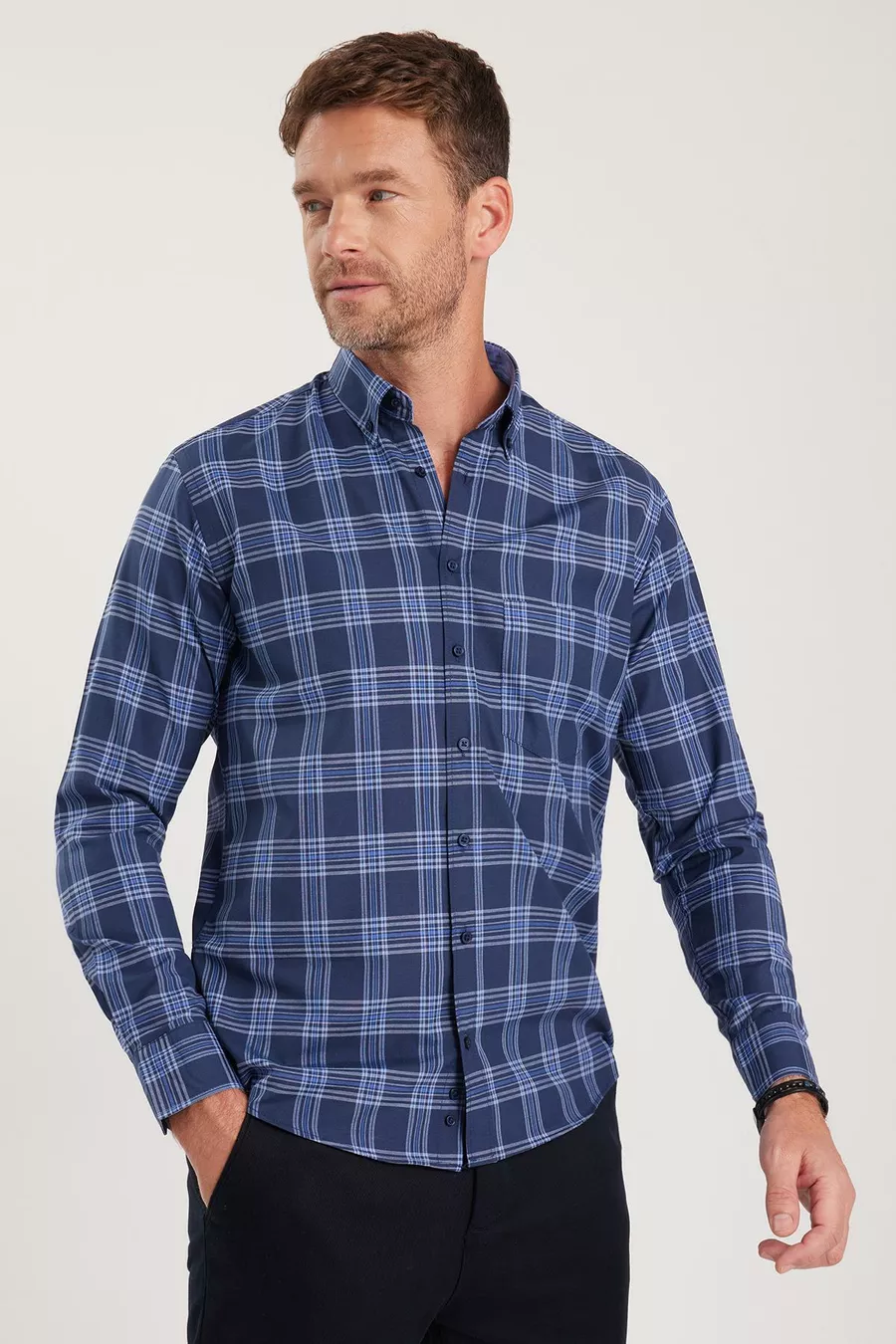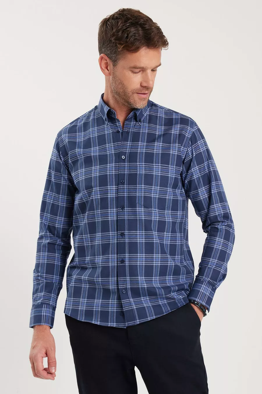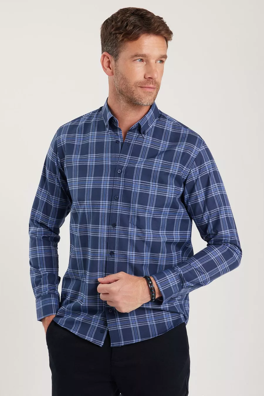 Erkek Regular Fit Klasik Kesim Pamuklu Küçük Kareli Düğmeli Yaka Gömlek
