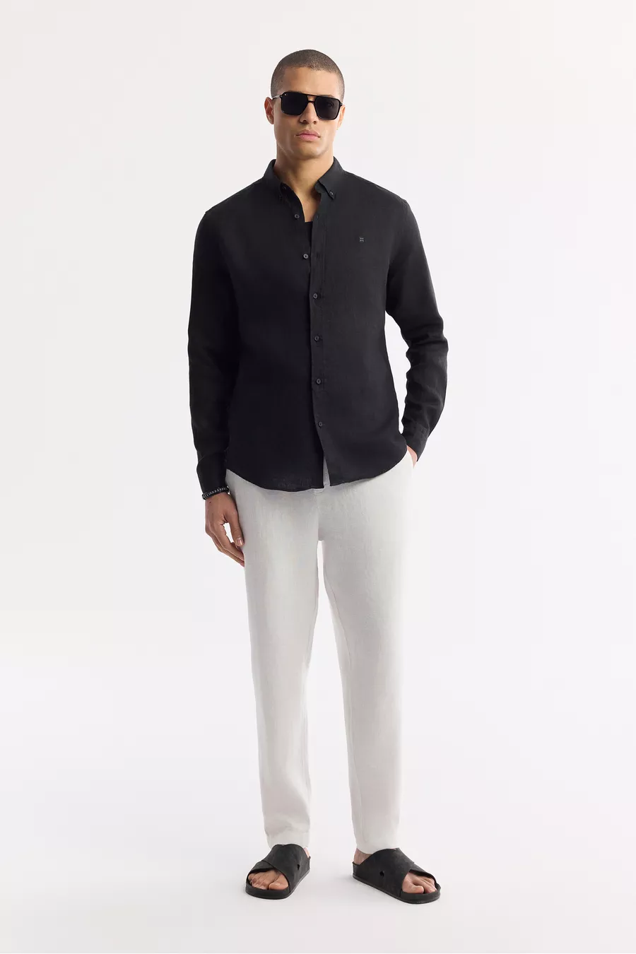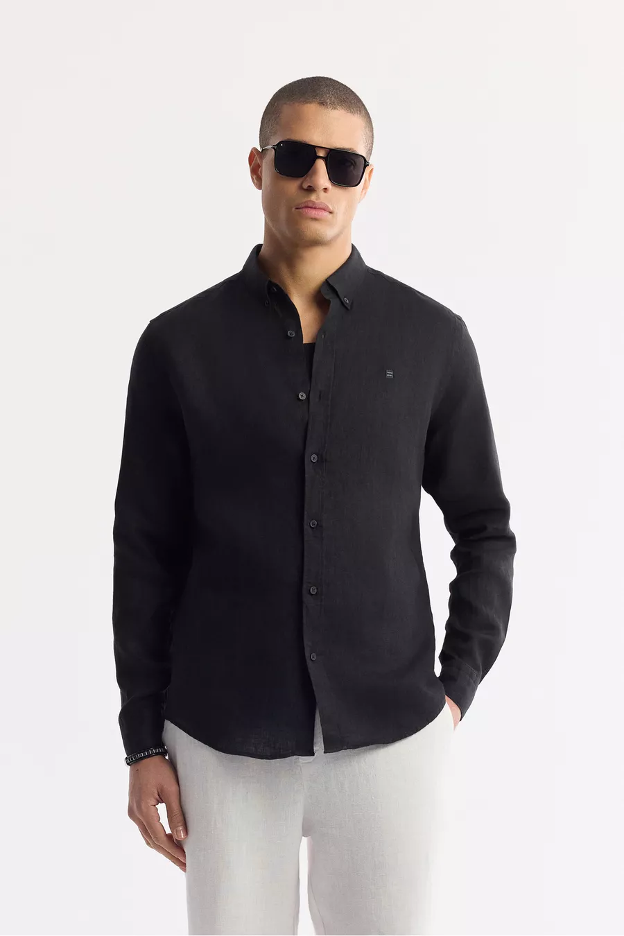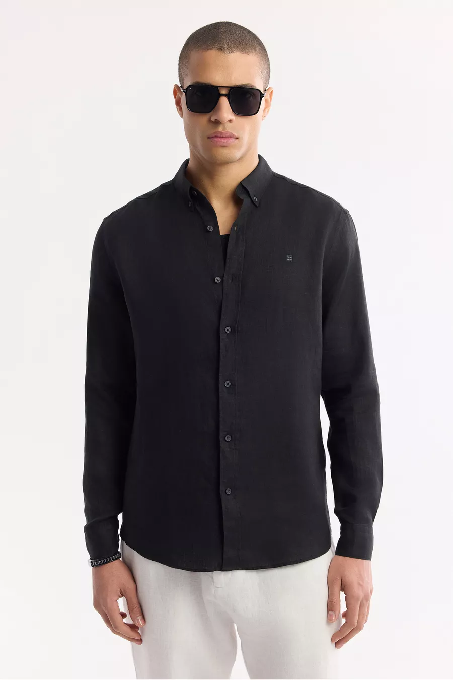 Erkek Siyah Düğmeli Yaka % Keten Comfort Fit Gömlek
