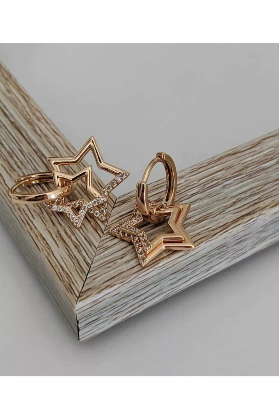 Gold Zirkon Taşlı Ikili Yıldız Küpe