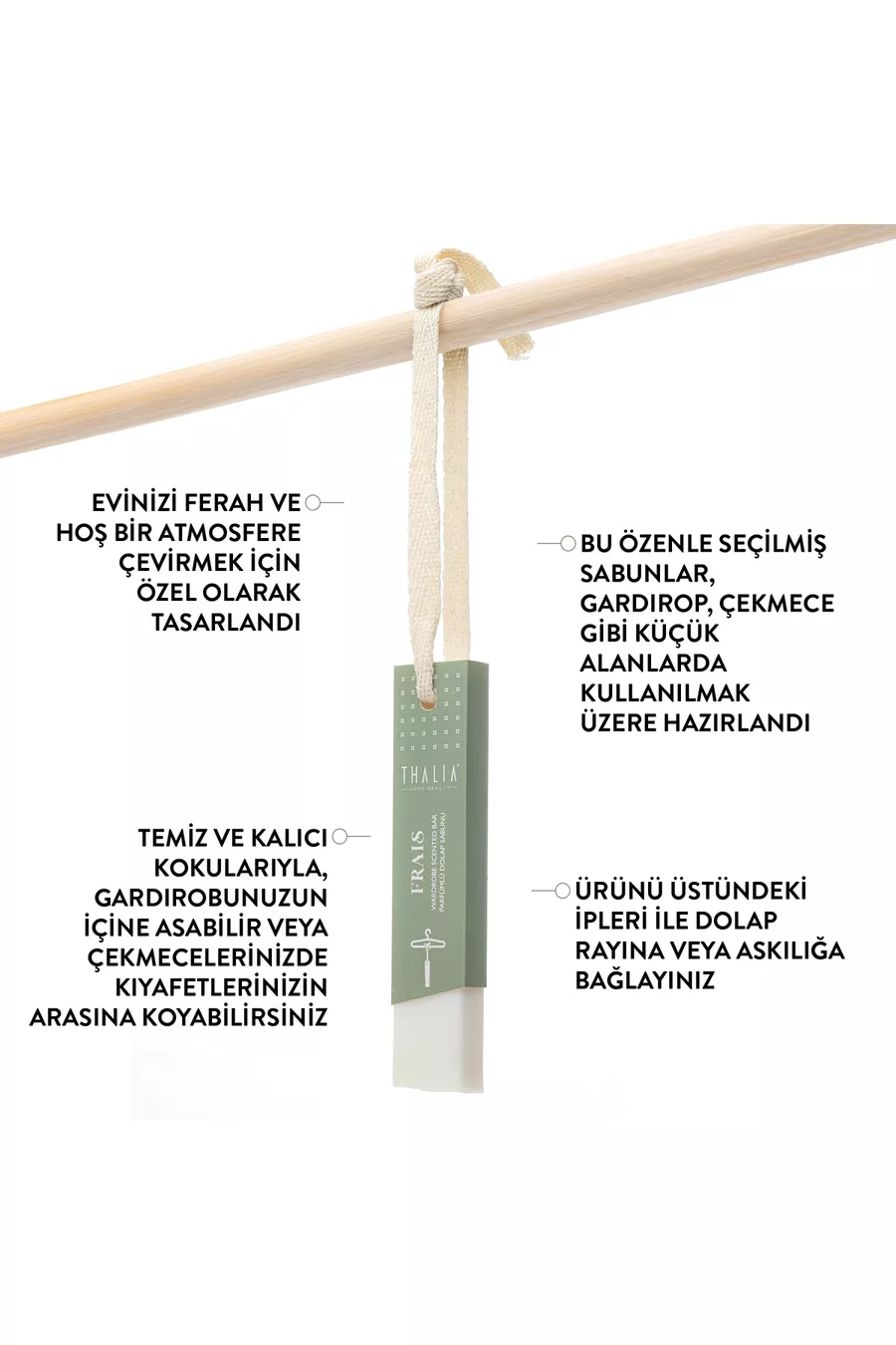 Diğer Özellikler:Queenmadam Home Sandal Ağacı & Gül Kokulu İpli Dolap Kokusu Çubuğu 3 x 40gr "Her giysi bir öyküdür, her öyküsü kokularla dolu: Queenmadam'nın zarif dokunuşuyla kıyafetlerinizin hikayesini yaşayın." Ürün bilgileri: Queenmadam Sandal Ağacı & Gül Kokulu Dolap Kokuları, evinizi ferah ve hoş bir atmosferle doldurmak üzere özenle tasarlandı. ; Bu özel sabunlar, gardırop, çekmece gibi küçük alanlarda kullanım için idealdir. ; Üst notalardaki frenk üzümü, armut ve pembe biber, sabunlara benzersiz bir açılış katarken, orta notalardaki yasemin, gül ve kediotu, kıyafetleriniz arasında muazzam bir çeşitlilik sunar