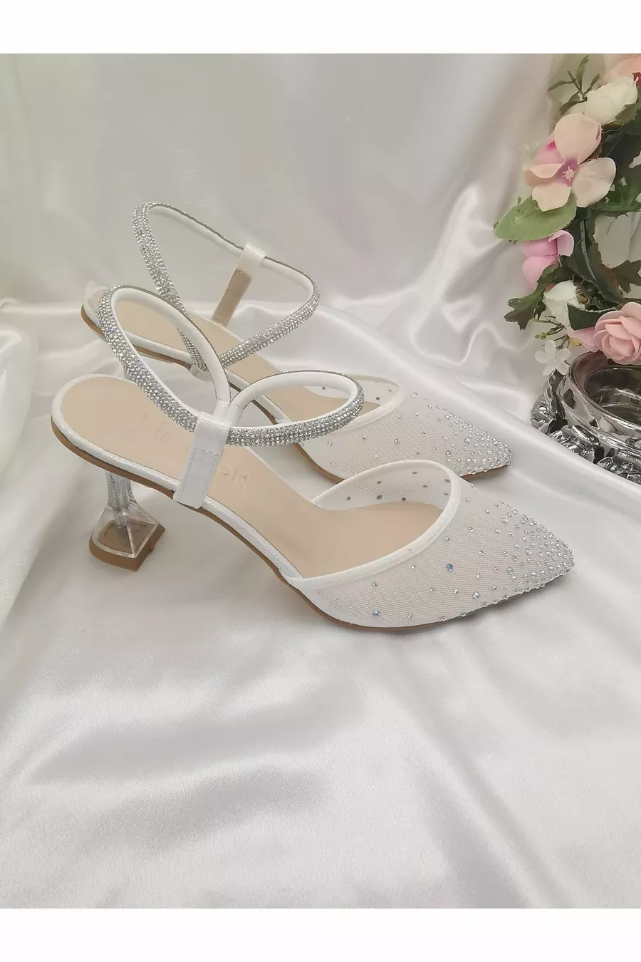 Kadın Sedef Kırık Beyaz 7 Cm Kadeh Topuklu Taşlı Sinderella Stiletto Gelin Ayakkabısı