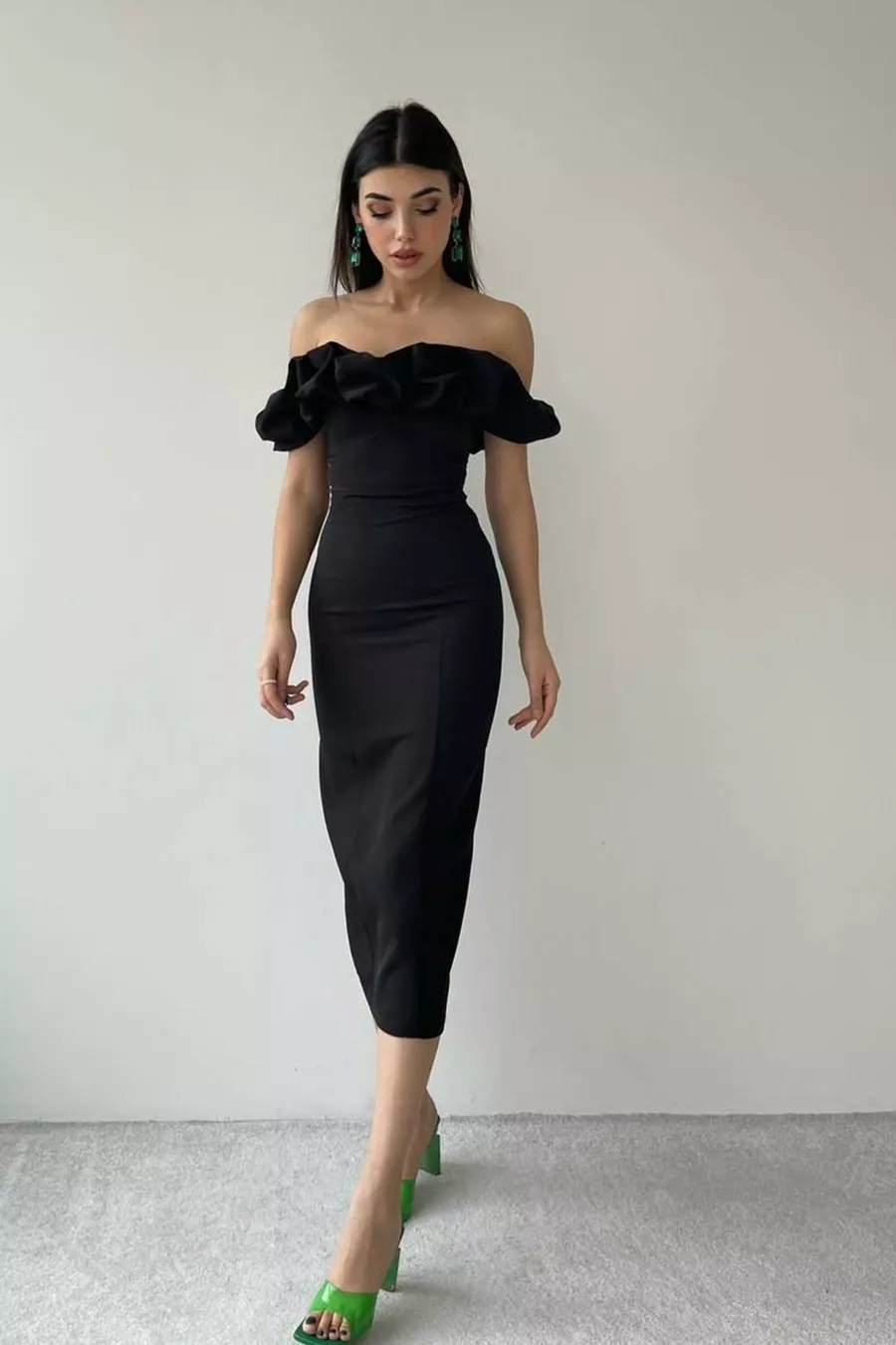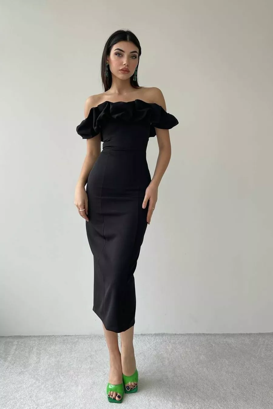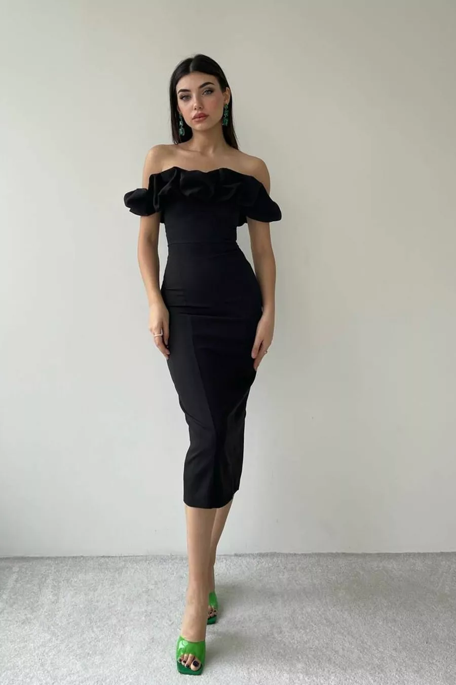 Kadın Straplez Yaka Düşük Omuz ve Yırtmaç Tasarımlı Midi Kalem Siyah Abiye Elbise
