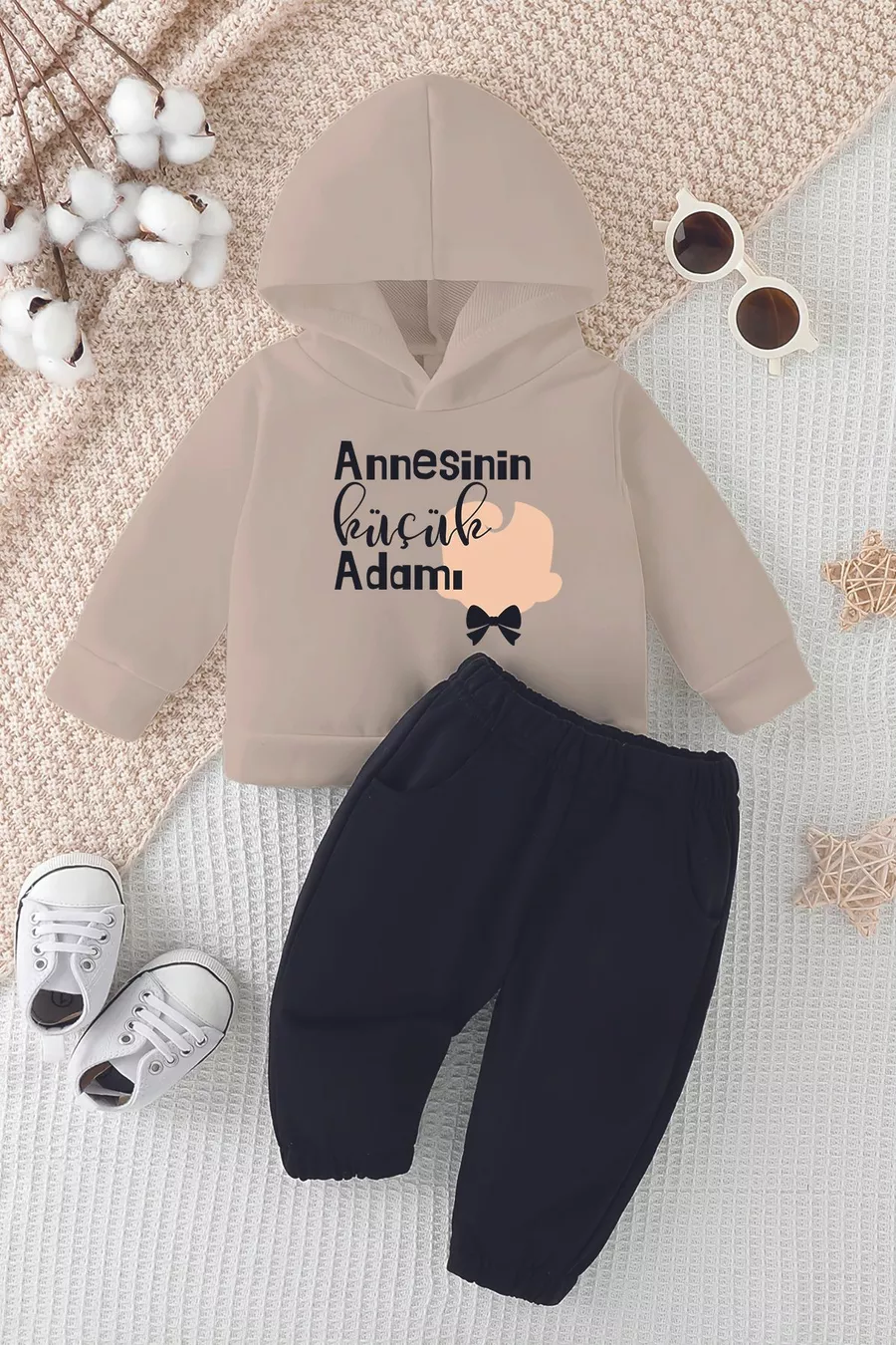 Kapşonlu Premium Annesinin Küçük Adamı Baskılı Bebek Takım