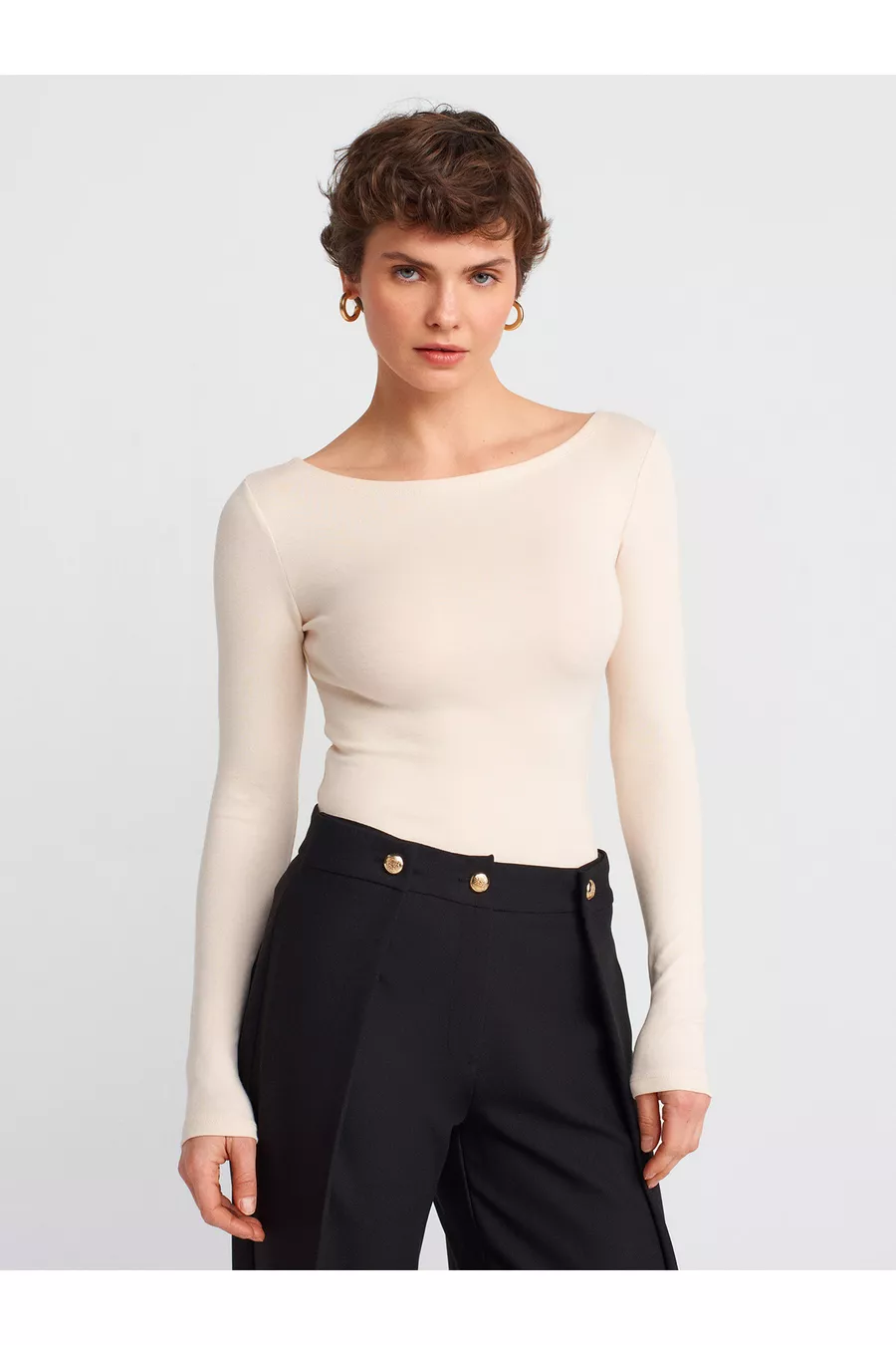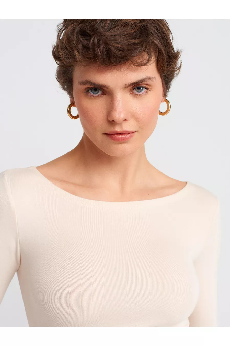 Kayık Yaka Uzun Kollu Top-Taş