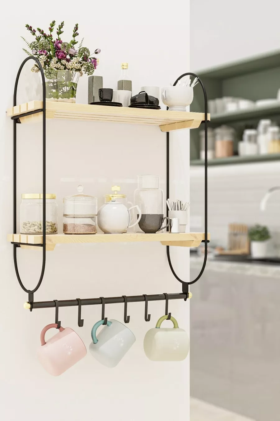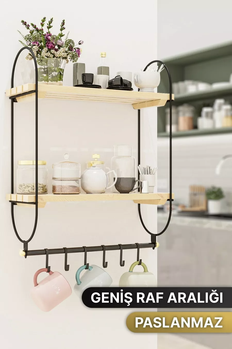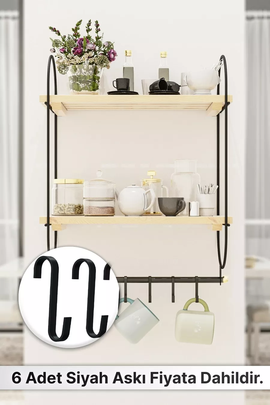 Mutfak Rafı Bardak Askısı Kahve Fincanı Kupa Askısı Düzenleyici 6 Kancalı Ahşap Raf Organizeri