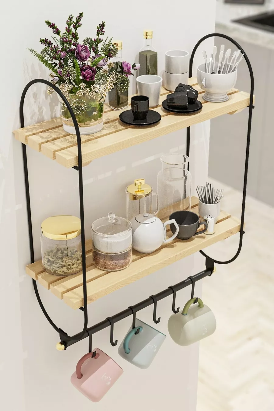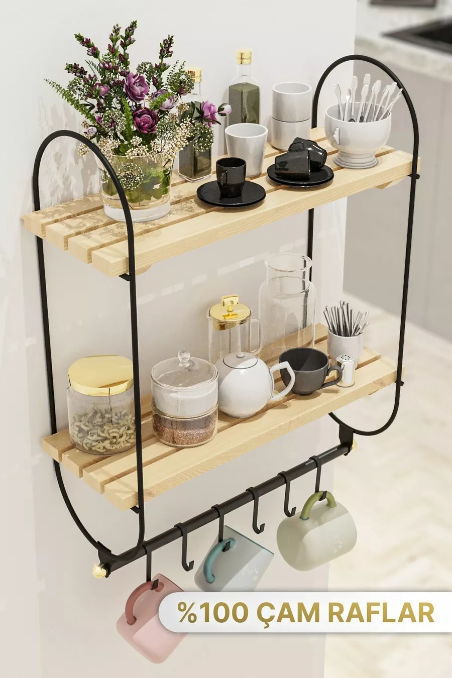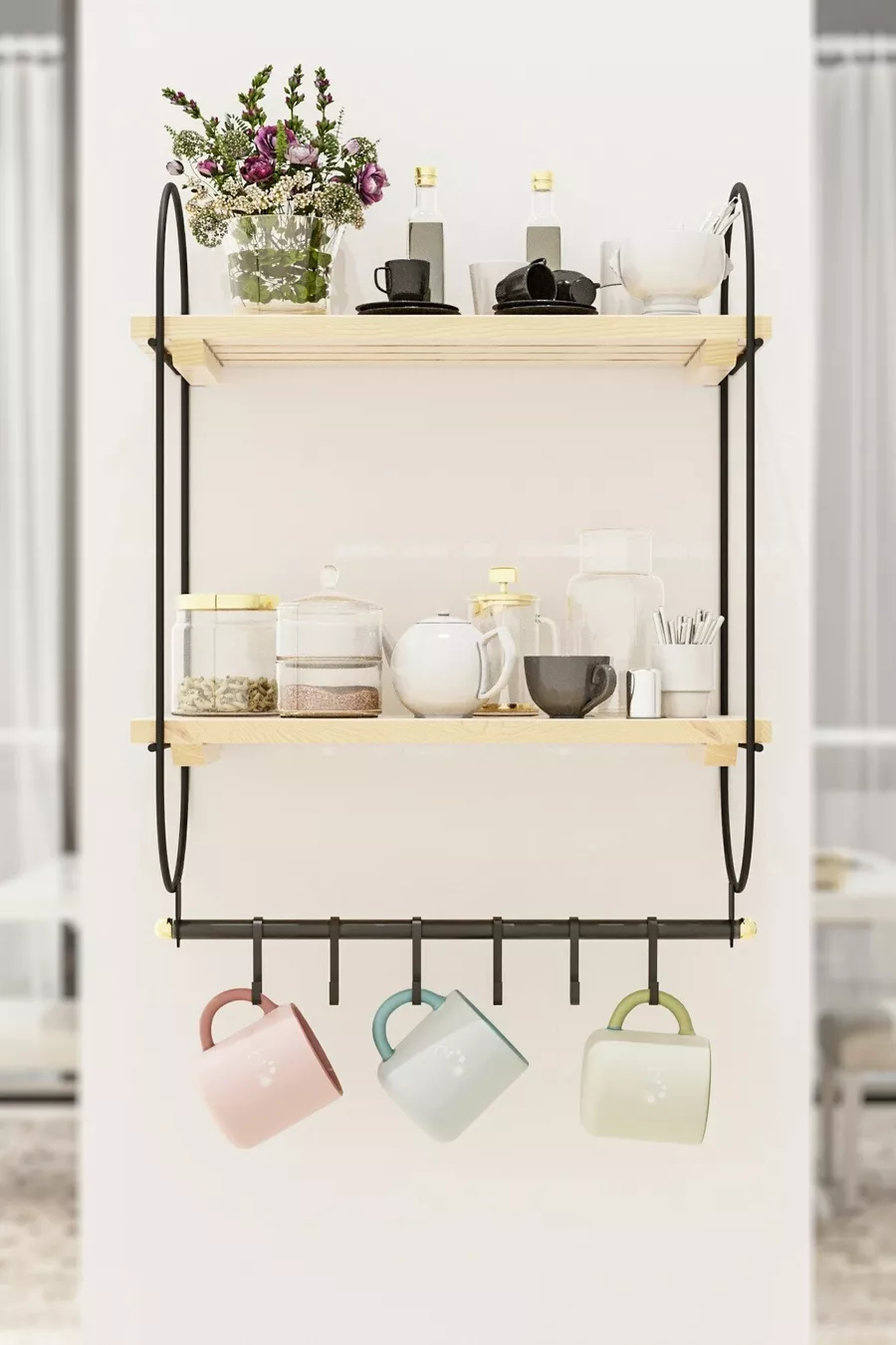 Mutfak Rafı Bardak Askısı Kahve Fincanı Kupa Askısı Düzenleyici 6 Kancalı Ahşap Raf Organizeri