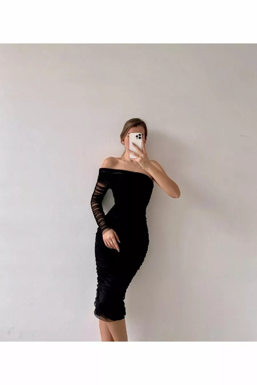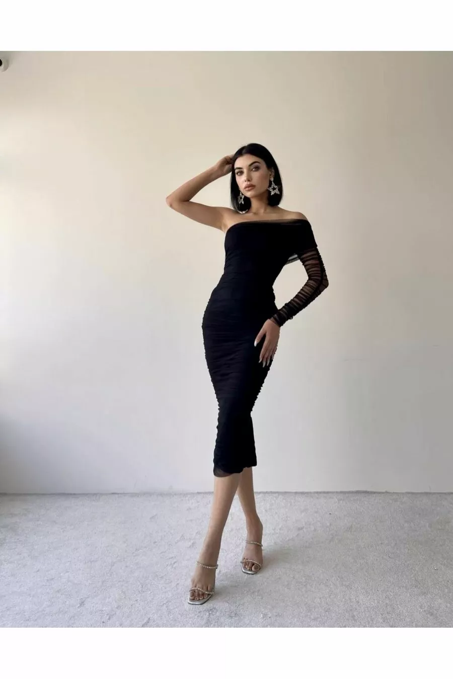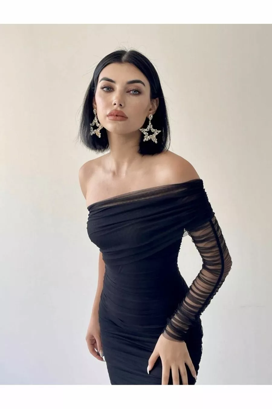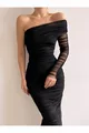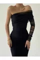 - Siyah Tek Omuz Tül Drapeli Elbise