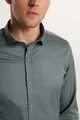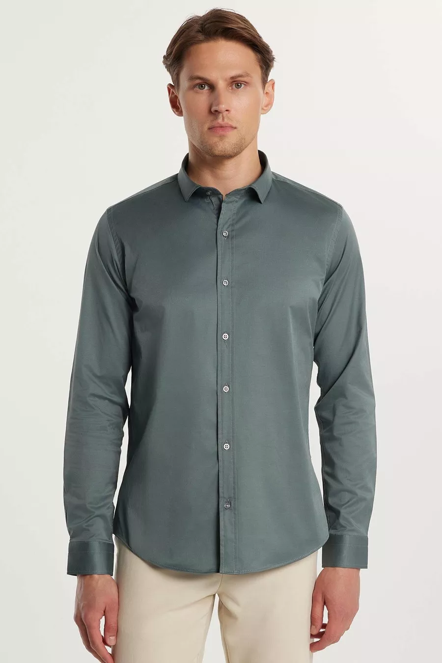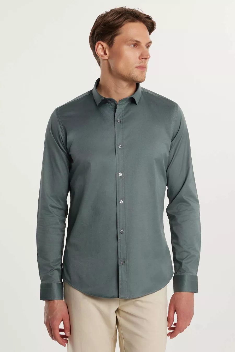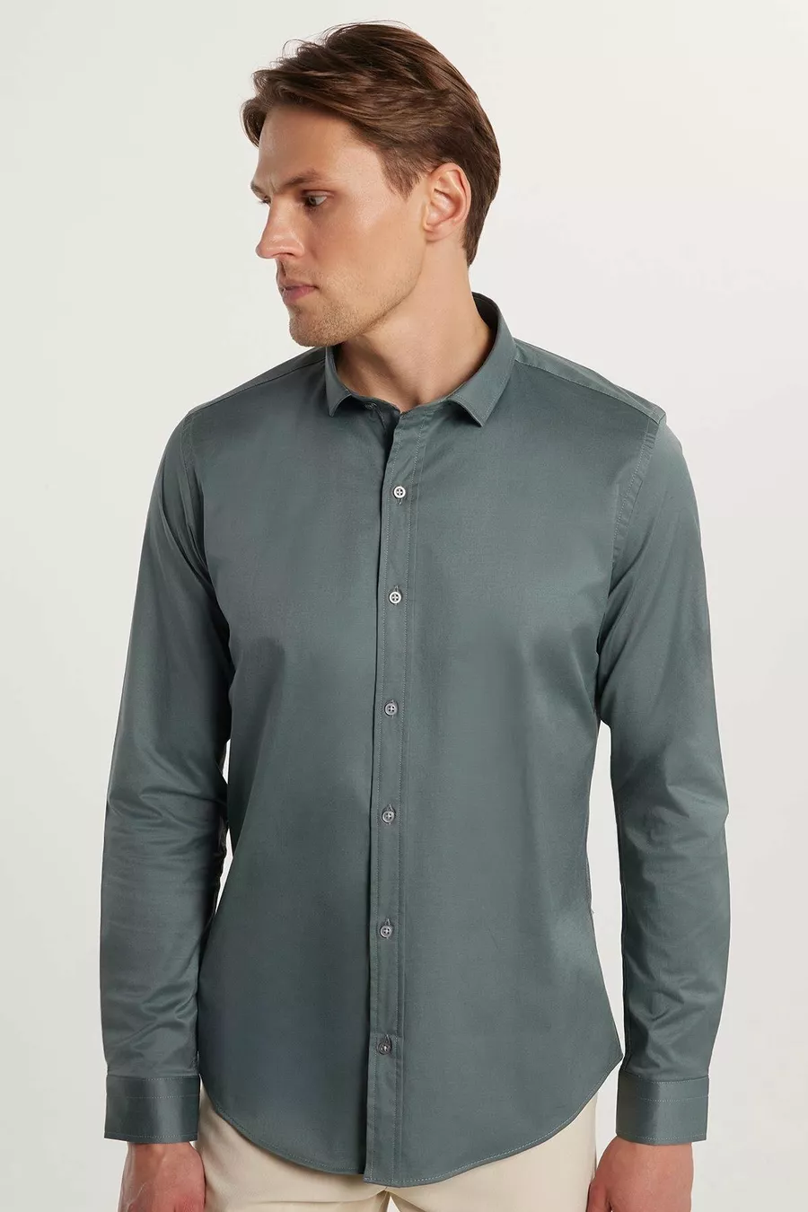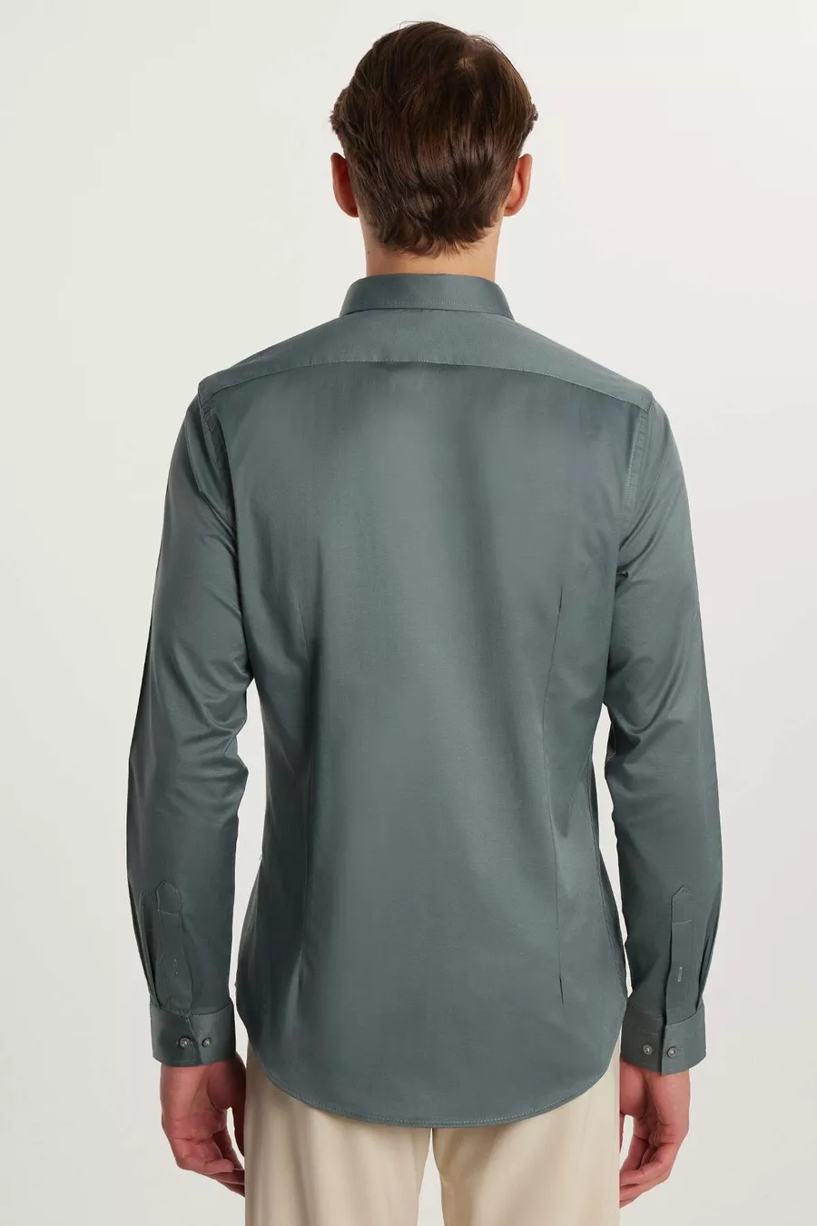 Slim Fit Uzun Kollu Likralı Düz Pamuk Saten Erkek Yeşil Gömlek