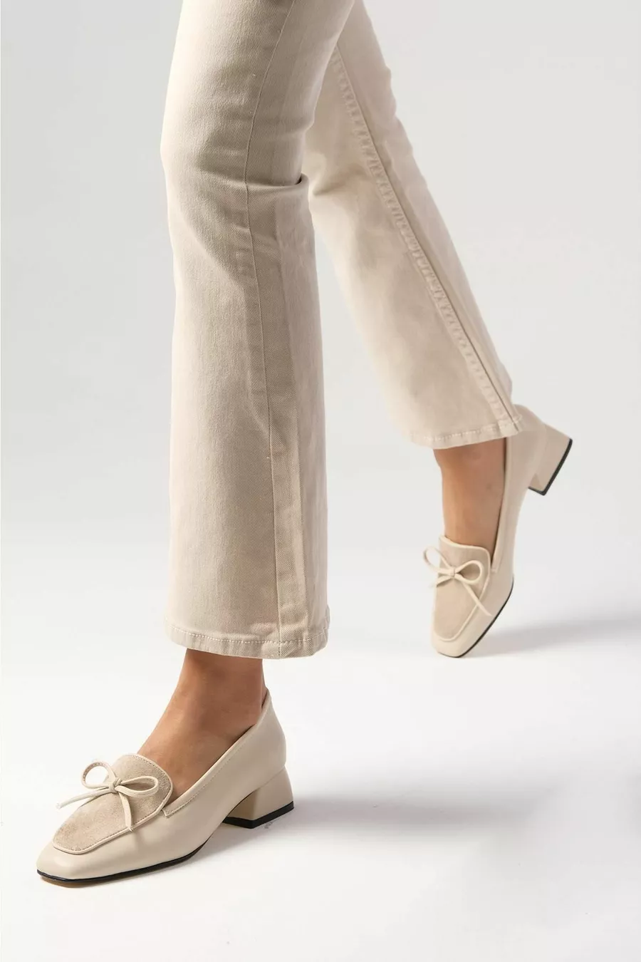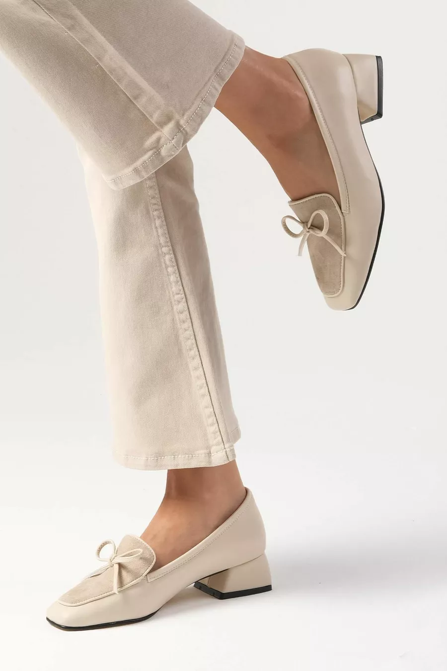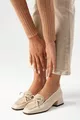 Bej renkküt burunlu,fiyonk aksesuarlıkısa topuklu ayakkabı